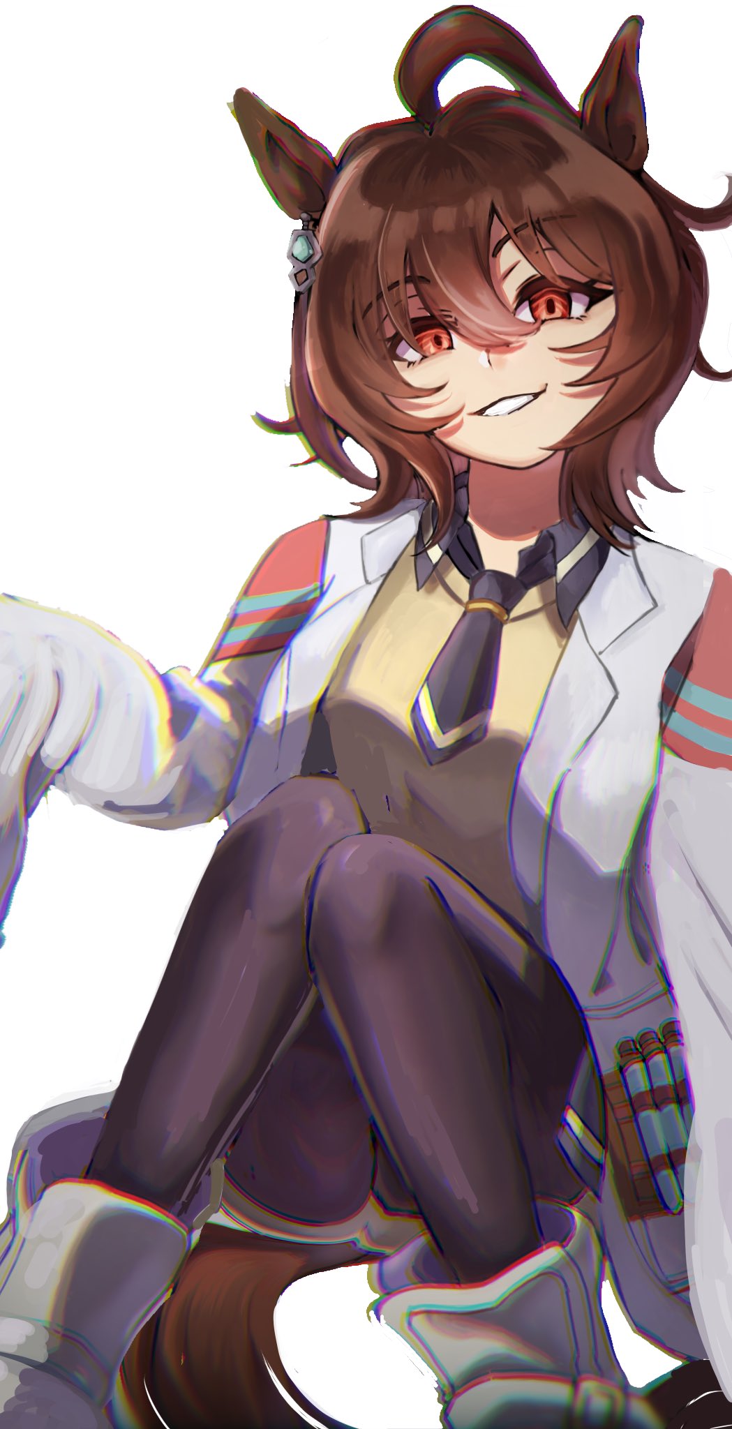 1girl agnes_tachyon_(tach-nology)_(umamusume) agnes_tachyon_(umamusume) ahoge black_pantyhose black_shirt brown_hair chemical_structure coat collared_shirt earrings hair_between_eyes highres huge_ahoge jewelry lab_coat long_sleeves open_clothes open_coat pantyhose parted_lips red_eyes shirt shoes short_hair simple_background single_earring sleeves_past_fingers sleeves_past_wrists smile solo sui_sui0510 sweater umamusume w/b white_coat white_shoes wolf_cut yellow_sweater