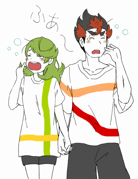 1boy 1girl alternate_costume black_hair black_shorts closed_eyes collarbone cowboy_shot green_hair hair_down hetero holding_hands kiawe_(pokemon) mallow_(pokemon) mameta_(mmtp_k10) multicolored_hair nintendo open_mouth pokemon pokemon_sun_and_moon red_hair shorts two-tone_hair yawning