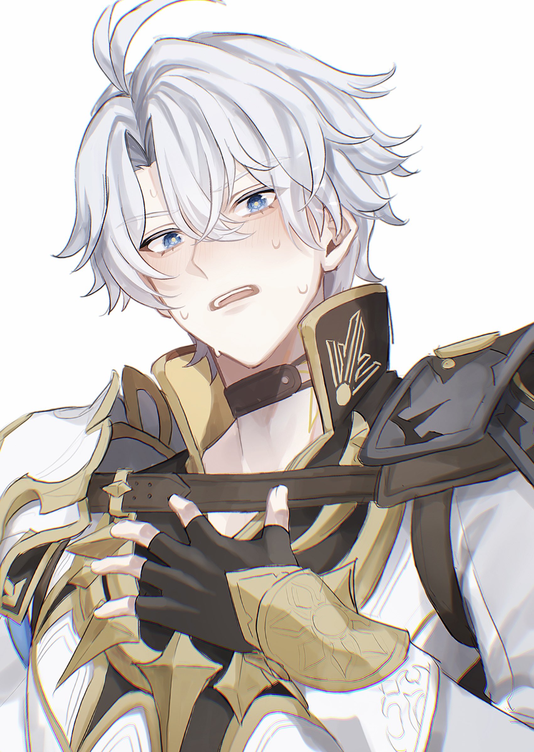 1boy antenna_hair armor black_choker black_gloves black_shirt blue_cape blue_eyes blush cape choker commentary fingerless_gloves fz7047 gloves highres honkai:_star_rail honkai_(series) looking_at_viewer male_focus neck_tattoo pauldrons phainon_(honkai:_star_rail) shirt short_hair shoulder_armor simple_background single_pauldron solo sweat untranslatable_commentary tattoo upper_body white_background white_hair