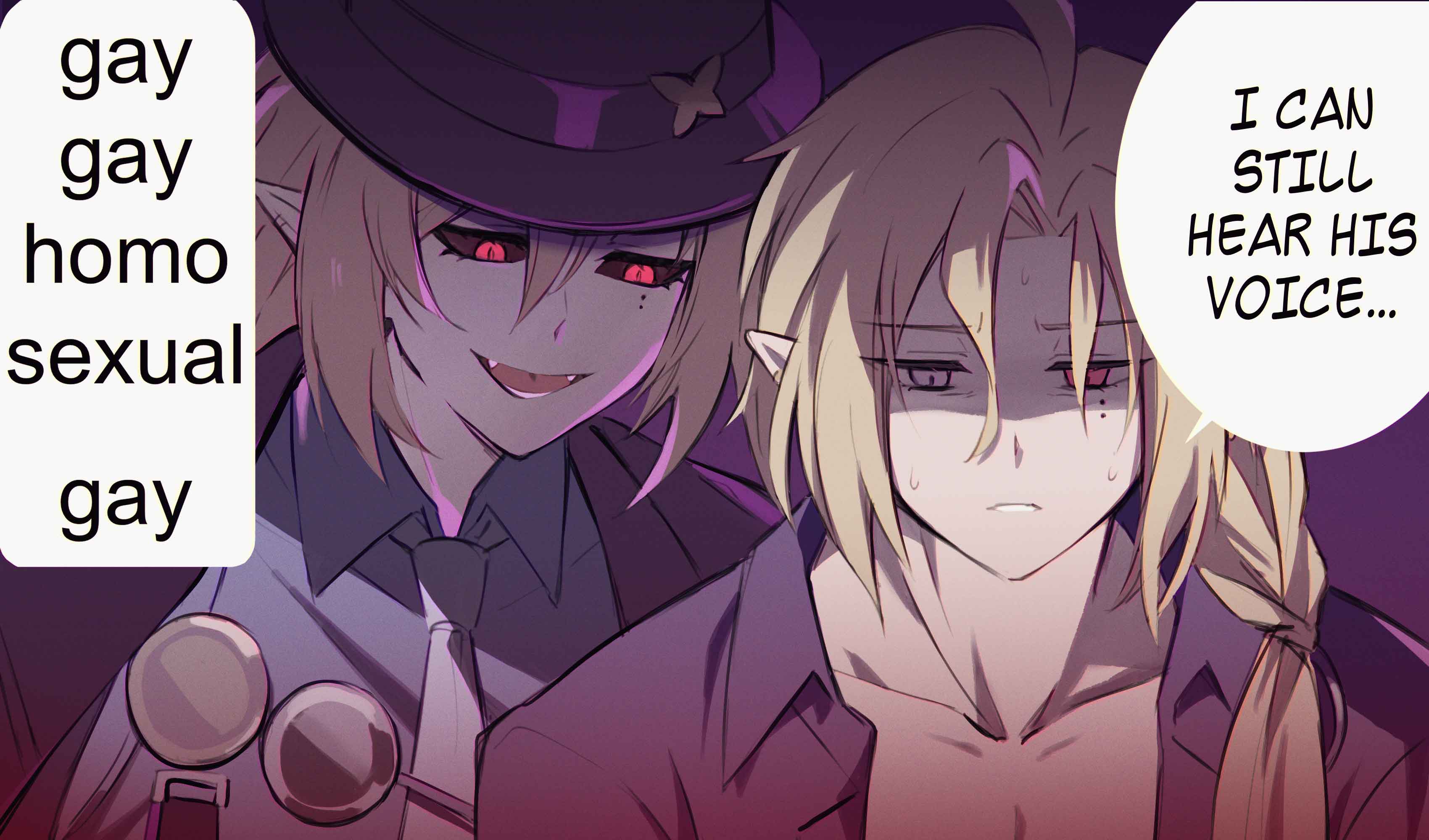 2boys :d absurdres ahoge black_sclera blonde_hair collared_shirt colored_sclera cthooliac dual_persona english_text fangs fedora gay_gay_homosexual_gay_(meme) grey_eyes hat heterochromia highres hugo_vlad long_hair looking_ahead male_focus meme mole mole_under_eye multiple_boys necktie open_mouth pointy_ears red_eyes shirt smile speech_bubble sweat unbuttoned white_necktie zenless_zone_zero