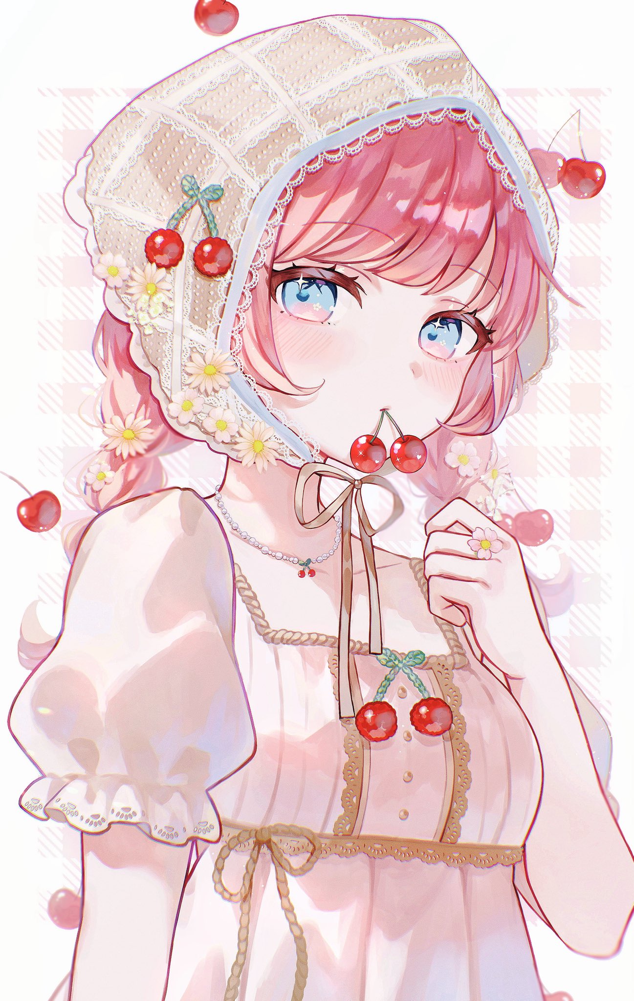 1girl blue_eyes blush braid cherry closed_mouth commentary dress food food_in_mouth fruit hand_up headscarf highres ilis_0226 jewelry long_hair looking_at_viewer mouth_hold necklace original red_hair short_sleeves simple_background solo square_neckline twin_braids upper_body white_background white_headscarf yellow_dress