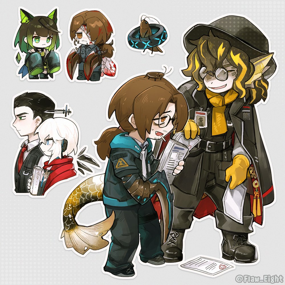 arthropod_limbs black_boots black_hair black_hat black_pants black_vest blonde_hair boots brown_eyes brown_hair bug cigarette closed_eyes cockroach executor_(arknights) executor_the_ex_foedere_(arknights) fins fish_tail flaw_eight g_corp._(identity)_(project_moon) glasses gregor_(project_moon) hat holding holding_paper insect lcb_uniform_(project_moon) lee_(arknights) limbus_company meursault_(project_moon) mon3tr_(arknights) multicolored_hair open_mouth pants paper parted_bangs pointy_ears project_moon rhodes_island_logo_(arknights) simple_background smile streaked_hair tail vest white_background white_hair