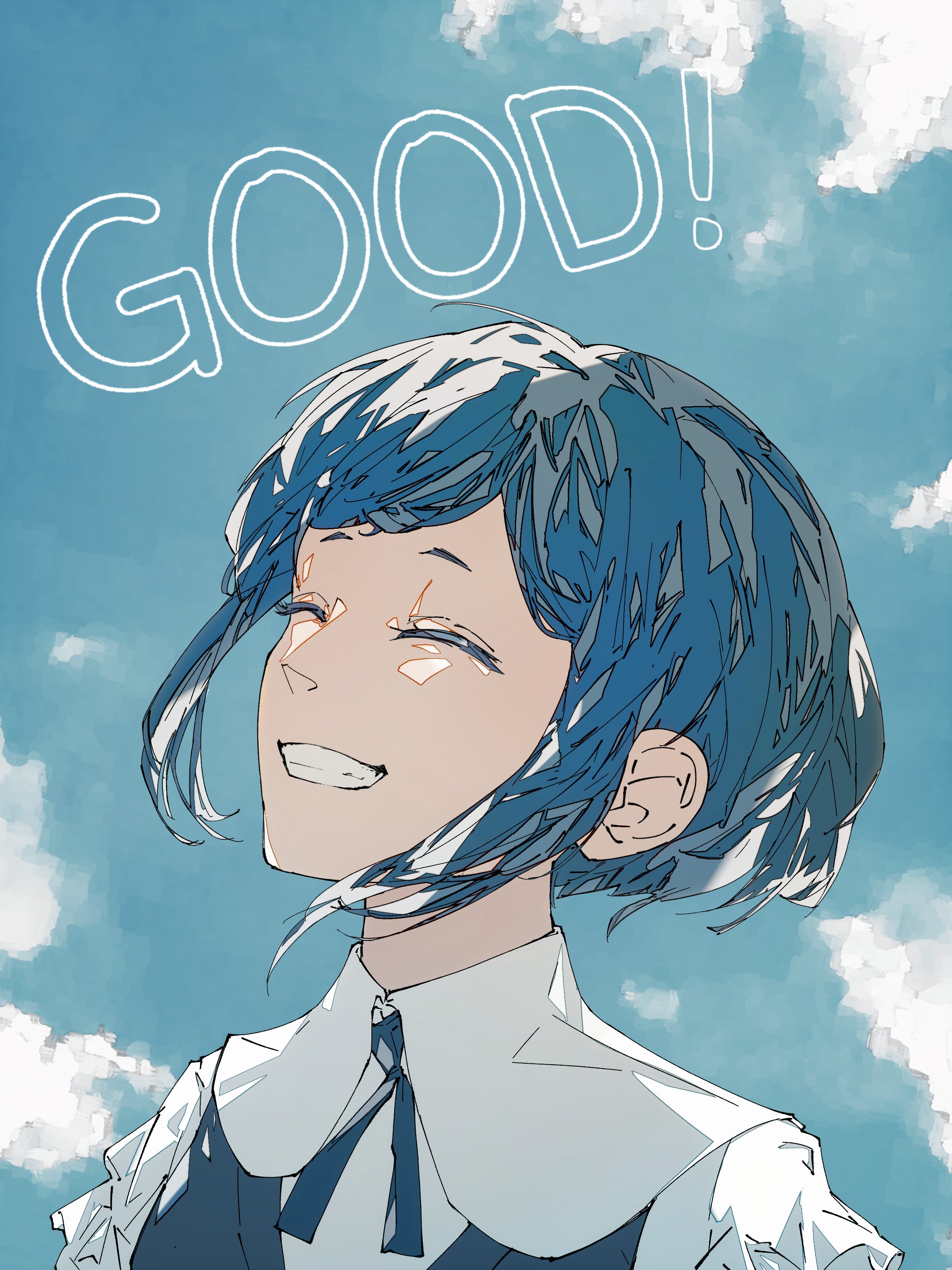 1girl absurdres blue_background blue_hair blue_sky closed_eyes cloud collared_shirt facing_viewer fukurai_azami grin highres ribbon shikishima_(3jikaika) shirt short_hair sky smile solo teeth toshi_densetsu_kaitai_center upper_body