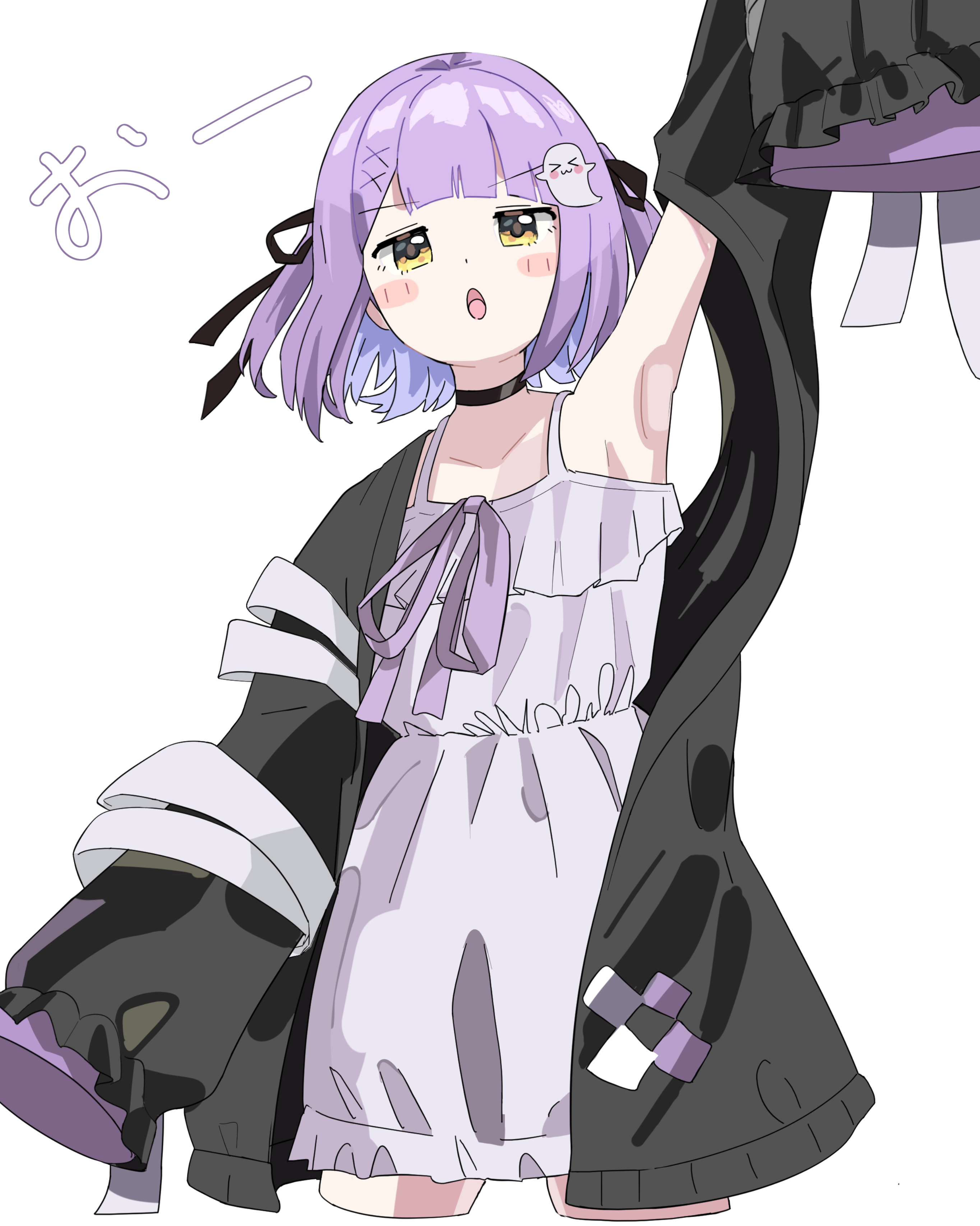 1girl absurdres black_choker black_jacket black_ribbon blush choker commentary cropped_legs dress ghost_hair_ornament grey_dress hair_ornament hair_ribbon hashtag-only_commentary highres jacket looking_at_viewer mitche open_mouth purple_hair purple_ribbon ribbon shinomiya_runa shinomiya_runa_(1st_costume) sleeves_past_fingers sleeves_past_wrists solo virtual_youtuber vspo! white_background yellow_eyes