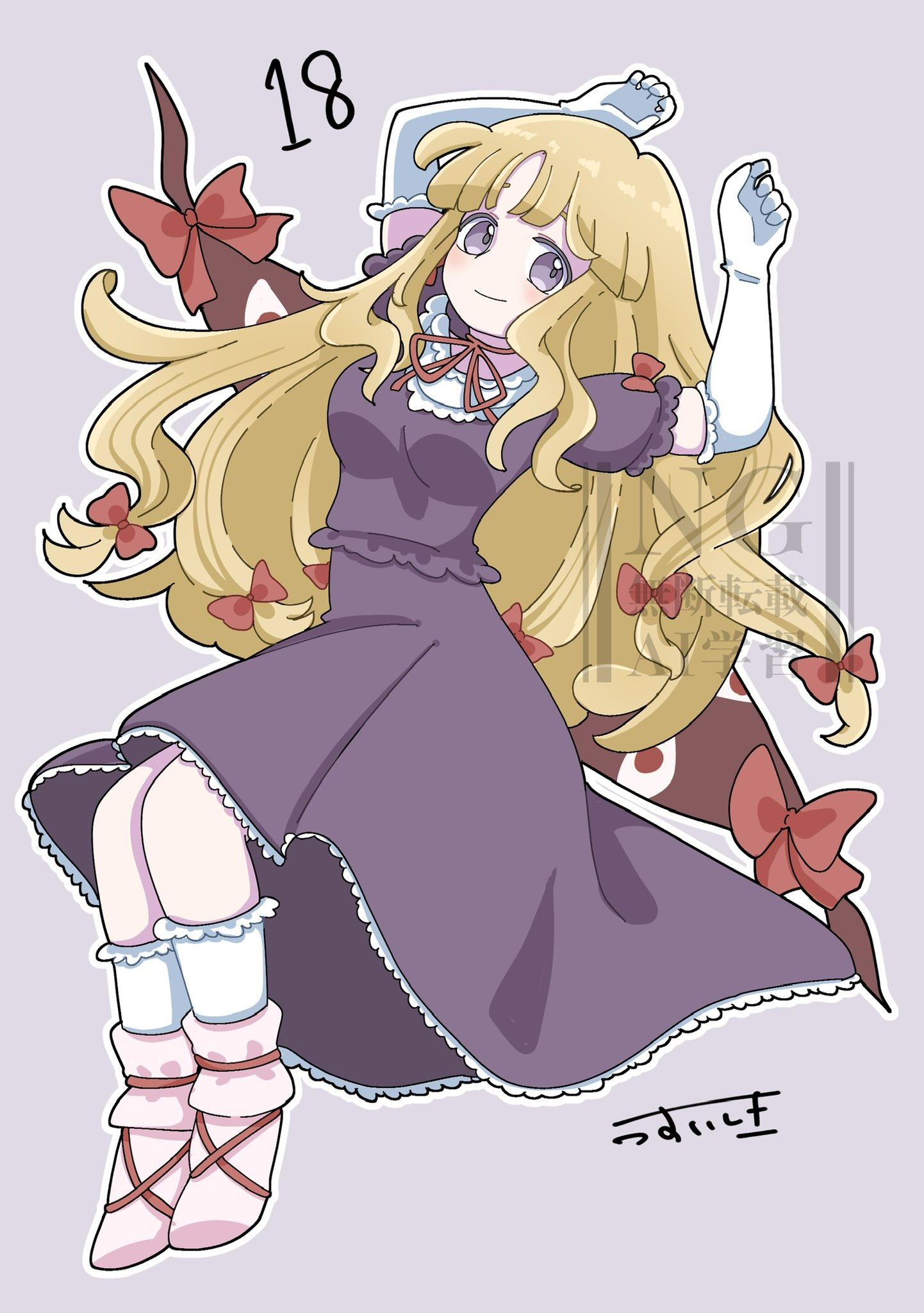 1girl blonde_hair choker comic_fate dress elbow_gloves full_body gap_(touhou) gloves hair_ribbon highres long_hair looking_at_viewer missing_headwear purple_dress purple_eyes ribbon ribbon_choker smile socks solo touhou very_long_hair watermark white_gloves white_socks yakumo_yukari