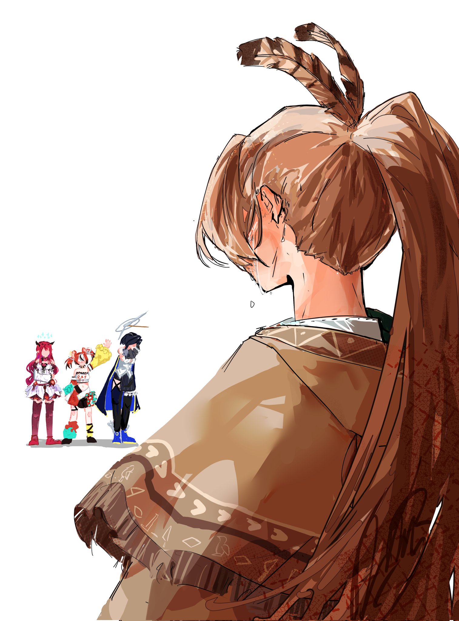 animal_ears asymmetrical_legwear asymmetrical_sleeves blue_hair brown_capelet brown_cloak cape capelet cloak crying demon_horns detached_sleeves dress faceless feather_hair_ornament feathers from_behind hair_intakes hair_ornament hakos_baelz hakos_baelz_(1st_costume) halo hieroglyphics highres hololive hololive_english hood hooded_cloak horns irys_(hololive) irys_(irys_2.0)_(hololive) leg_warmers long_hair looking_at_another magsomething mechanical_halo mismatched_legwear mismatched_sleeves mouse_ears mouse_girl nanashi_mumei nanashi_mumei_(1st_costume) ouro_kronii ouro_kronii_(1st_costume) ponytail purple_hair red_hair shirt sidelocks sleeveless sleeveless_shirt thighhighs very_long_hair virtual_youtuber waving white_dress