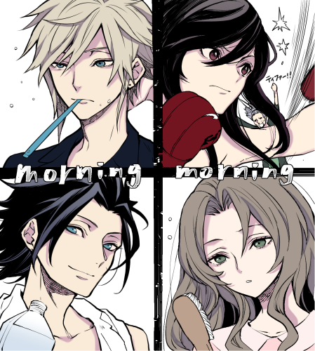 2boys 3girls aerith_gainsborough arm_up black_hair blonde_hair blue_eyes bottle boxing boxing_gloves brown_hair closed_mouth cloud_strife crisis_core:_final_fantasy_vii earrings final_fantasy final_fantasy_vii final_fantasy_vii_remake gloves green_eyes grey_hair hair_between_eyes hair_brush holding holding_bottle holding_hair_brush jewelry long_hair lowres marle_(ff7r) mono0805 morning multiple_boys multiple_girls old old_woman parted_bangs parted_lips red_eyes red_gloves short_hair spiked_hair stud_earrings tifa_lockhart toothbrush towel towel_around_neck training upper_body zack_fair