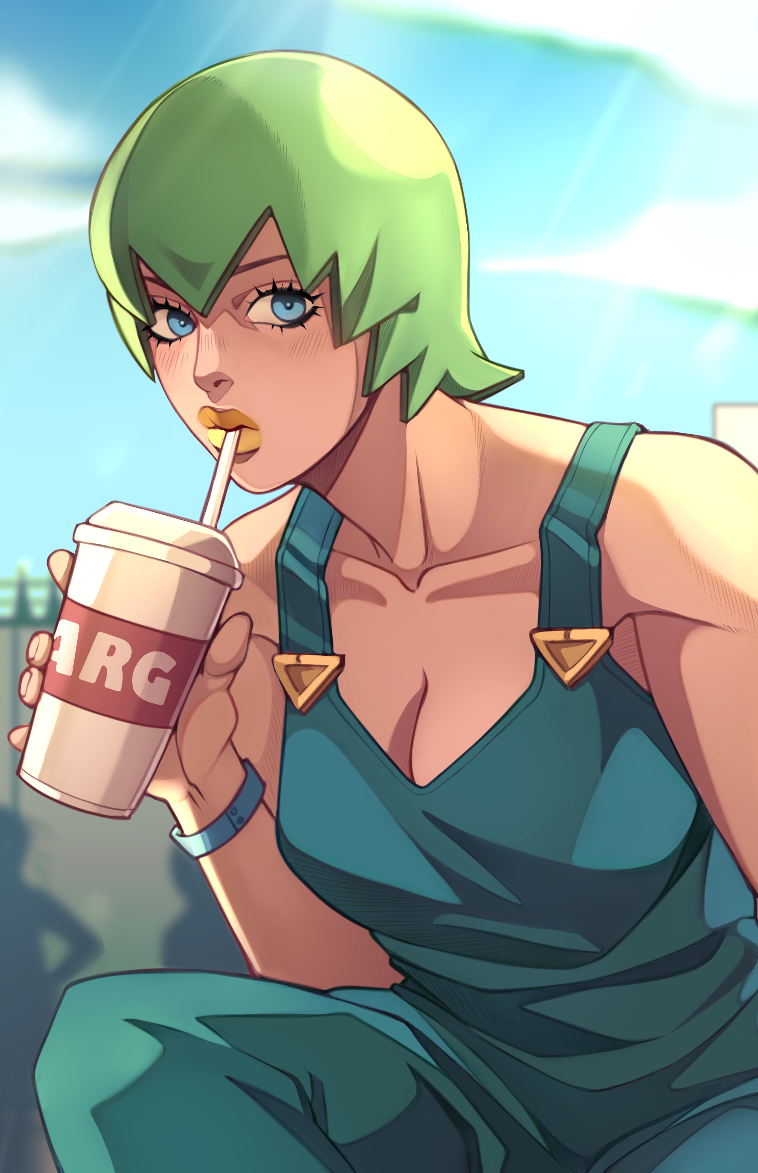 1girl absurdres blue_eyes blue_overalls breasts cleavage collarbone commentary cup disposable_cup drink drinking drinking_straw drinking_straw_in_mouth english_commentary foo_fighters_(jojo) green_hair highres holding holding_cup idinahui_pls jojo_no_kimyou_na_bouken looking_at_viewer medium_breasts overalls short_hair sky solo stone_ocean