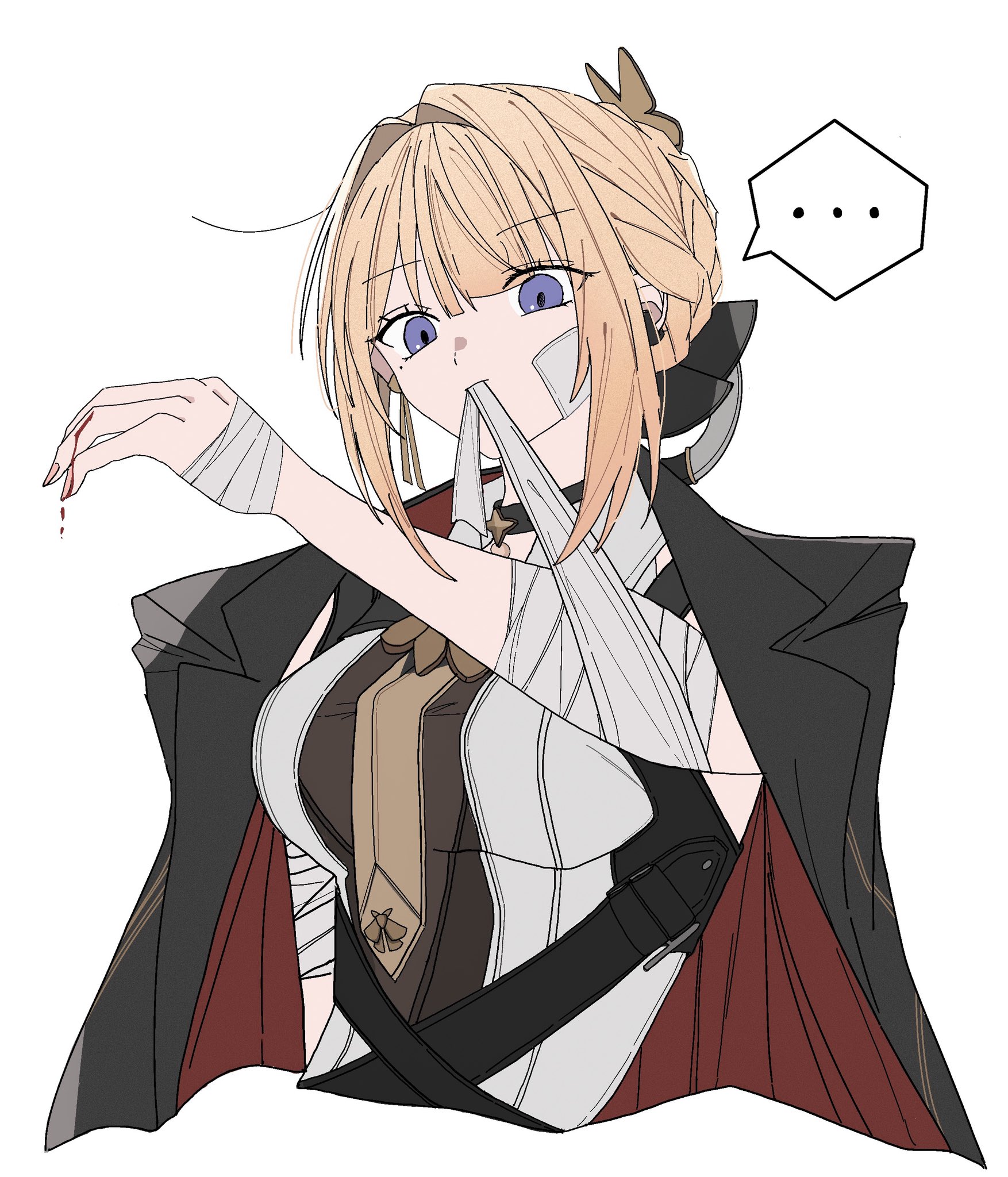 ... 1girl bandage_on_face bandaged_arm bandages black_coat blonde_hair blood blue_eyes coat coat_on_shoulders collared_shirt evelyn_chevalier hair_intakes highres necktie niupum shirt uneven_bangs upper_body white_background white_shirt yellow_necktie zenless_zone_zero