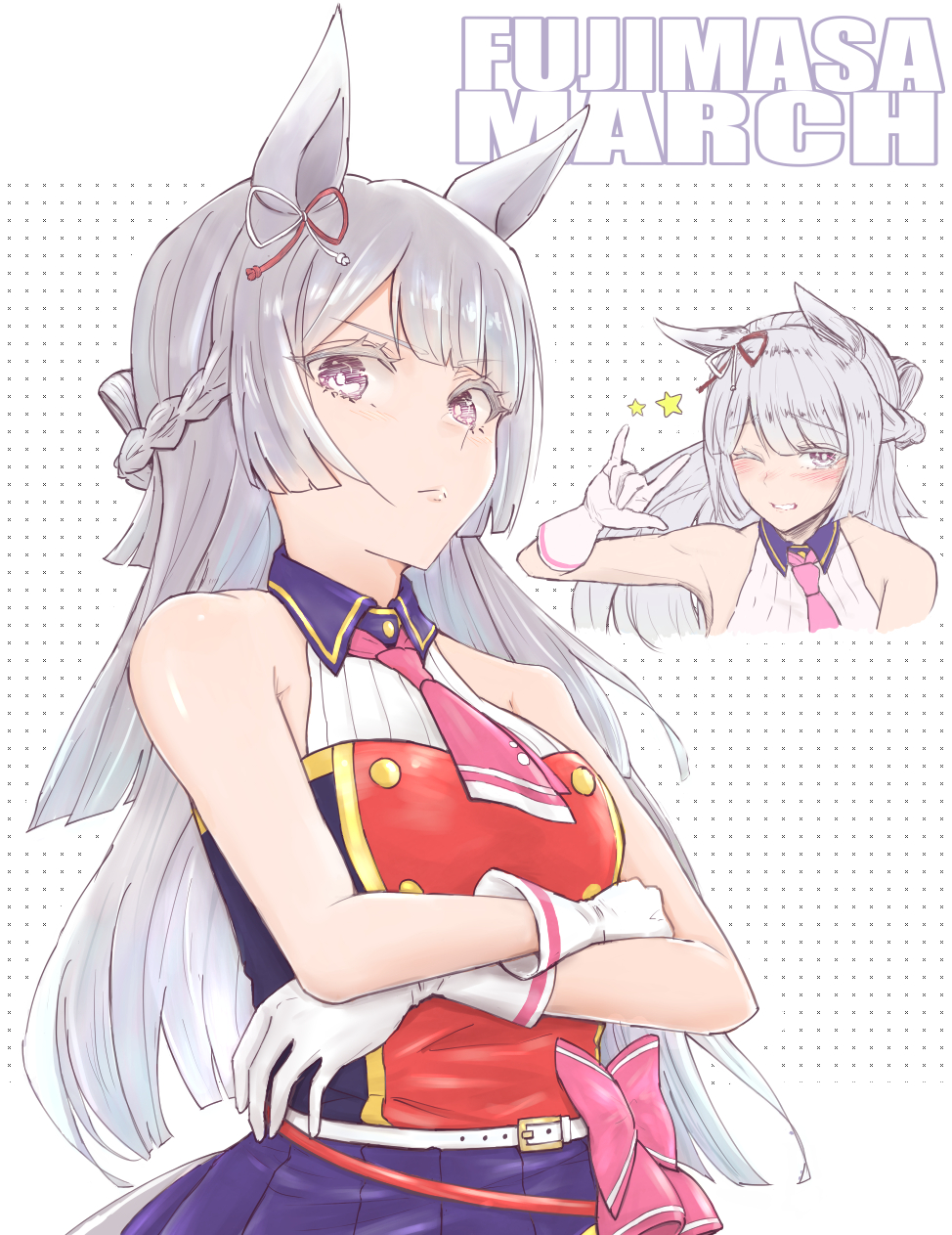 1girl ;d \m/ alternate_costume animal_ears armpit_crease bare_shoulders blunt_bangs blunt_ends bow braid breasts character_name closed_mouth collared_shirt commentary_request cropped_torso crossed_arms crown_braid design_speculation dolbydig ear_bow ear_ribbon frown fujimasa_march_(umamusume) gloves grey_hair grin half_up_braid half_updo highres idol long_hair looking_at_viewer medium_breasts multiple_views necktie one_eye_closed open_mouth partial_commentary pink_necktie pleated_skirt purple_eyes purple_skirt red_shirt shirt skirt sleeveless sleeveless_shirt smile split_mouth standing straight_hair text_background umamusume umamusume:_cinderella_gray upper_body v-shaped_eyebrows white_background white_gloves