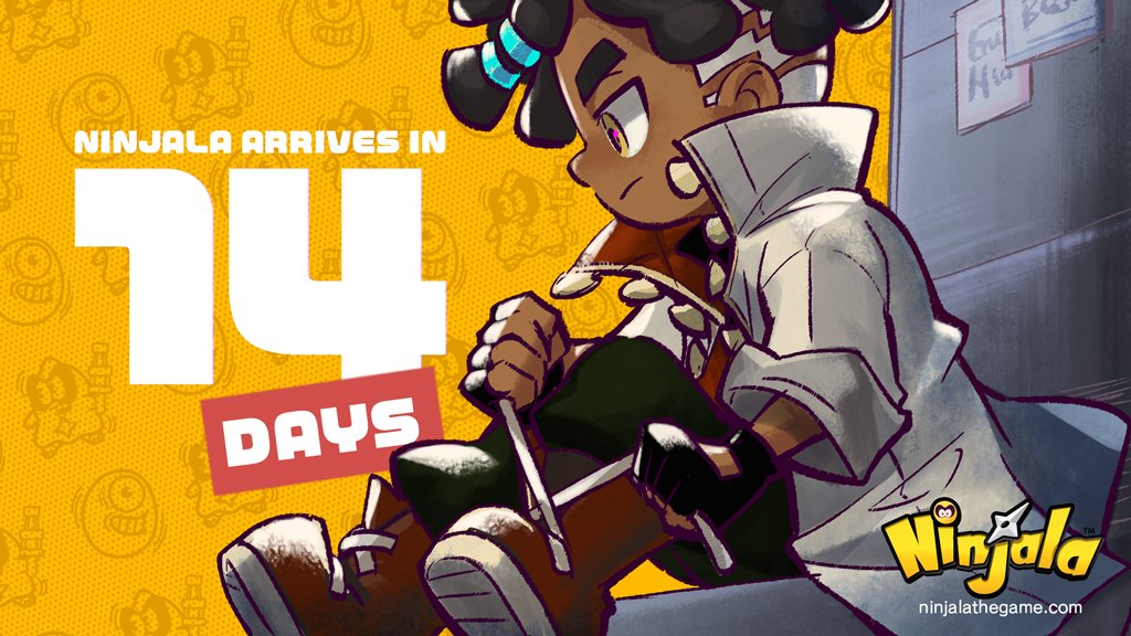 1boy ankle_boots asymmetrical_hair baggy_pants black_gloves black_hair black_sweater boots brown_boots character_background child closed_mouth coat collar collared_coat collared_sweater commentary copyright_name copyright_notice countdown dark-skinned_male dark_skin dreadlocks english_commentary fingerless_gloves frown gloves green_pants gumchi gungho hair_tie halftone halftone_background high_collar lace-up_boots logo ninjala official_art orange_background outline pants polka_dot polka_dot_background popped_collar profile purple_outline rianti-wong ribbed_sweater ron_(ninjala) second-party_source short_hair shuriken sidecut sitting sleeves_rolled_up solo sweater thick_eyebrows turtleneck turtleneck_sweater two-sided_coat two-sided_fabric tying_footwear undercut watermark weapon web_address white_coat white_sleeves wide_sleeves yellow_eyes zipper