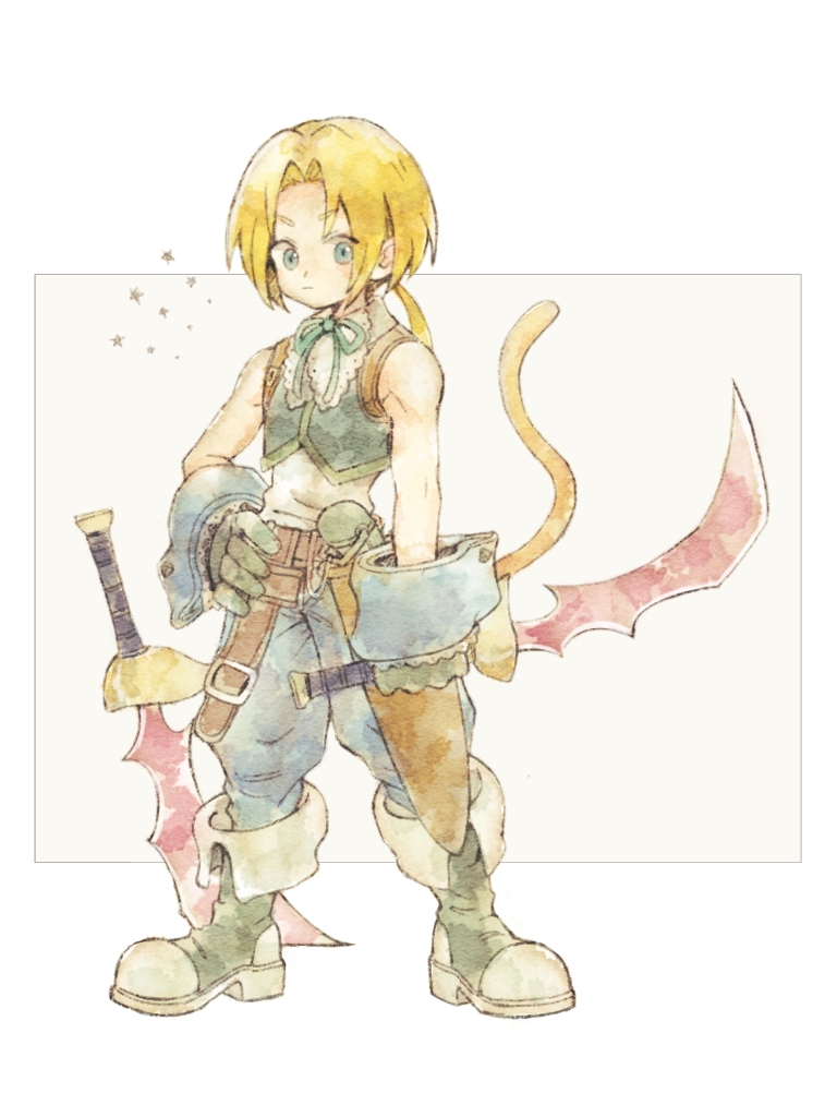 bare_shoulders blonde_hair blue_pants blue_wrist_cuffs boots bow bowtie final_fantasy final_fantasy_ix gloves green_eyes green_gloves green_vest holding holding_sword holding_weapon ichi_(pixiv6373491) low_ponytail monkey_tail pants ponytail scabbard sheath shirt simple_background sleeveless sleeveless_shirt sword tail vest weapon white_shirt wrist_cuffs zidane_tribal