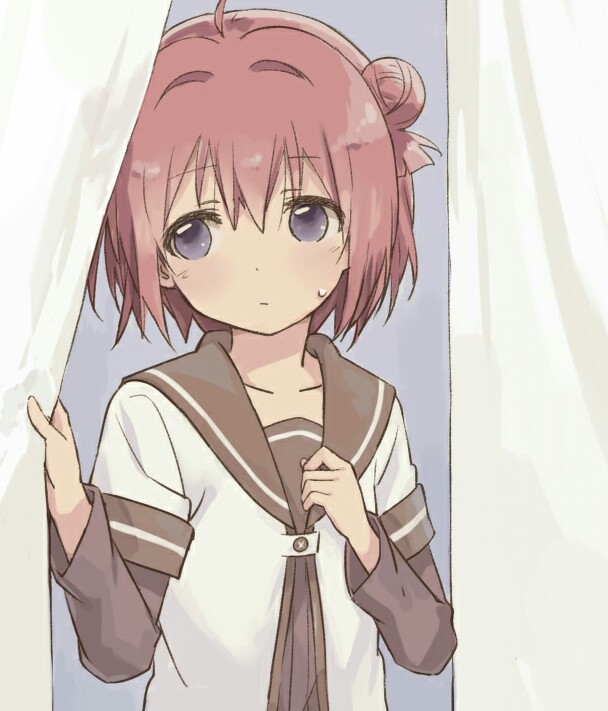 1girl ahoge akaza_akari brown_sailor_collar cropped curtain_grab curtains dress hair_bun layered_sleeves long_sleeves looking_to_the_side nanamori_school_uniform pink_hair purple_eyes red_hair sailor_collar sailor_dress school_uniform serafuku shikou_sakugo_(qqap9gt9k) short_hair short_over_long_sleeves short_sleeves single_hair_bun solo sweatdrop third-party_edit yuruyuri