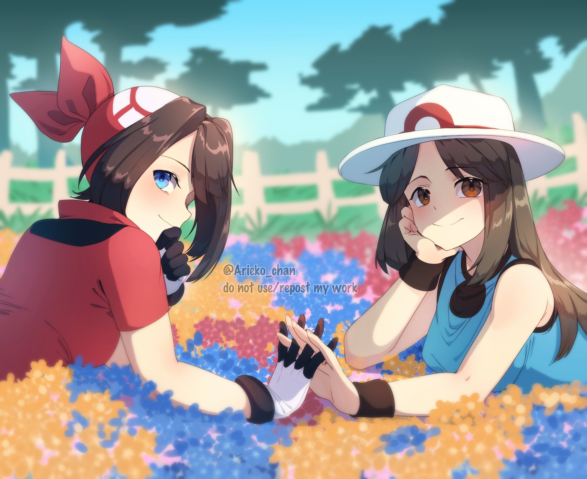 2girls ariekochan bandana black_gloves blue_eyes blue_shirt blurry blurry_background brown_eyes brown_hair closed_mouth commentary english_commentary fence field flower flower_field gloves hat highres interlocked_fingers jewelry leaf_(pokemon) long_hair looking_at_viewer may_(pokemon) multiple_girls nintendo on_flower pokemon pokemon_firered_and_leafgreen pokemon_ruby/sapphire/emerald red_bandana red_shirt ring shirt short_hair short_sleeves sleeveless sleeveless_shirt smile twitter_username two-tone_gloves upper_body white_gloves white_hat wooden_fence wristband yuri