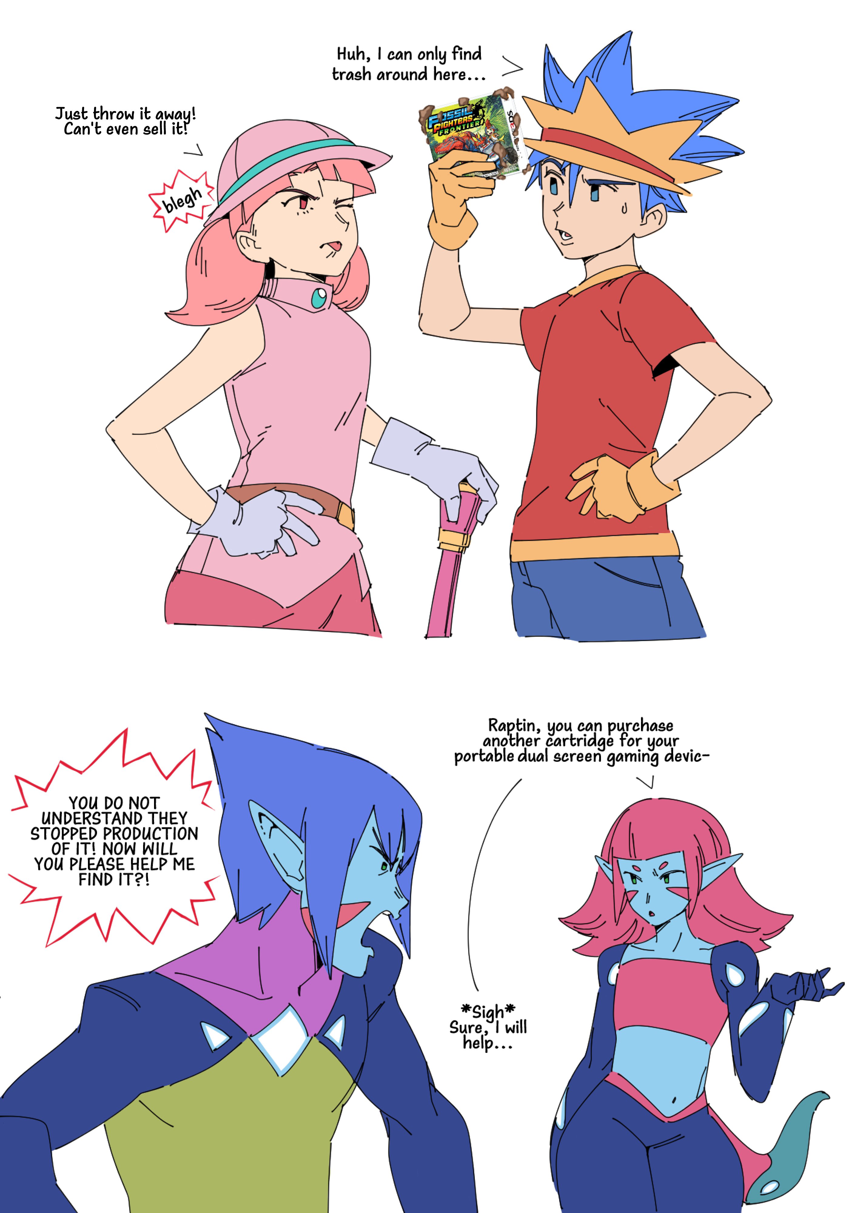 2boys 2girls absurdres belt blue_hair blue_pants blue_skin brown_belt colored_skin duna_(fossil_fighters) english_text food_fr_tht fossil_fighters gloves grey_gloves hand_on_own_hip hat highres hunter_(fossil_fighters) jacket multiple_boys multiple_girls navel one_eye_closed open_mouth pants pink_hair pink_hat pink_jacket pointy_ears raptin_(fossil_fighters) red_shirt rosie_(fossil_fighters) shirt short_sleeves simple_background sleeveless sleeveless_jacket tail white_background yellow_gloves