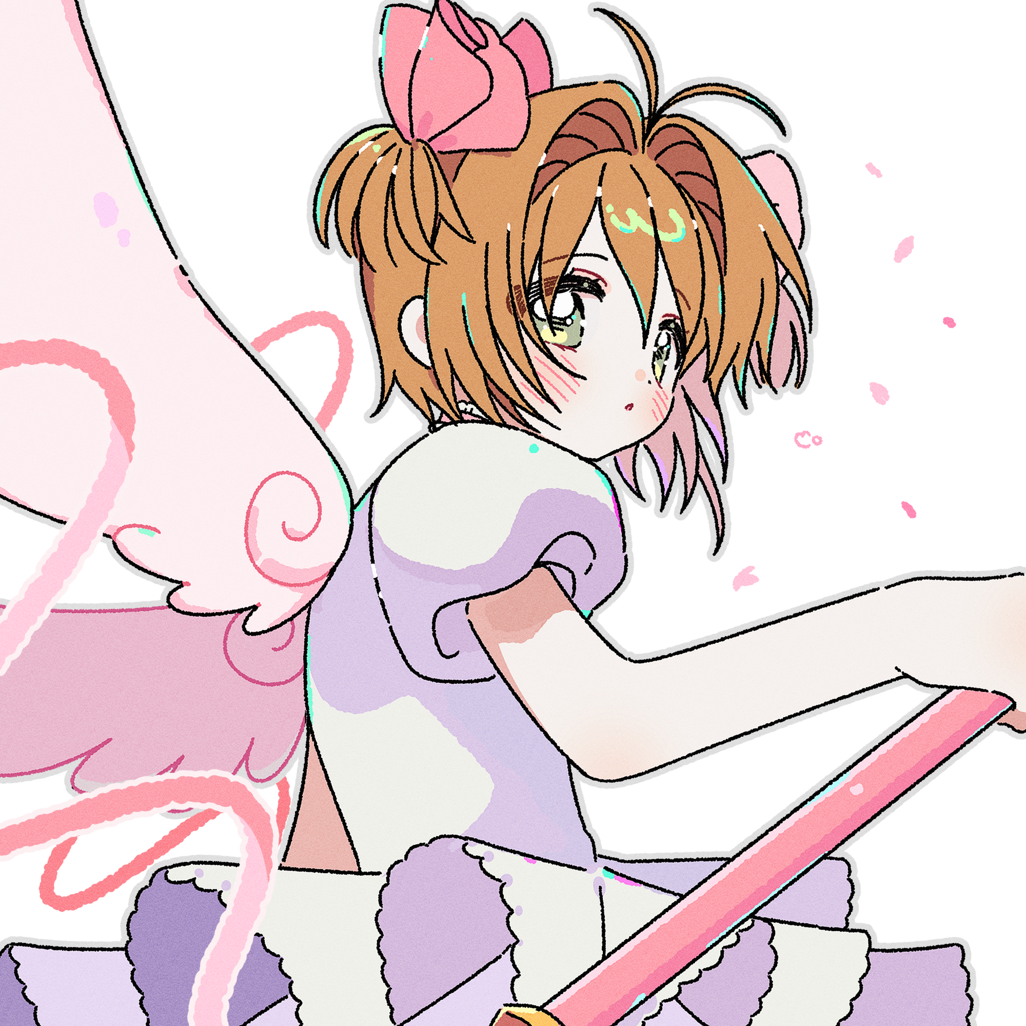 1girl blush brown_hair cardcaptor_sakura dress green_eyes hair_ribbon highres holding holding_wand kinomoto_sakura kinomoto_sakura_(astral_sakura) magical_girl parted_lips pink_ribbon ribbon short_hair short_sleeves simple_background solo two_side_up upper_body wand white_background white_dress wings yalmyu