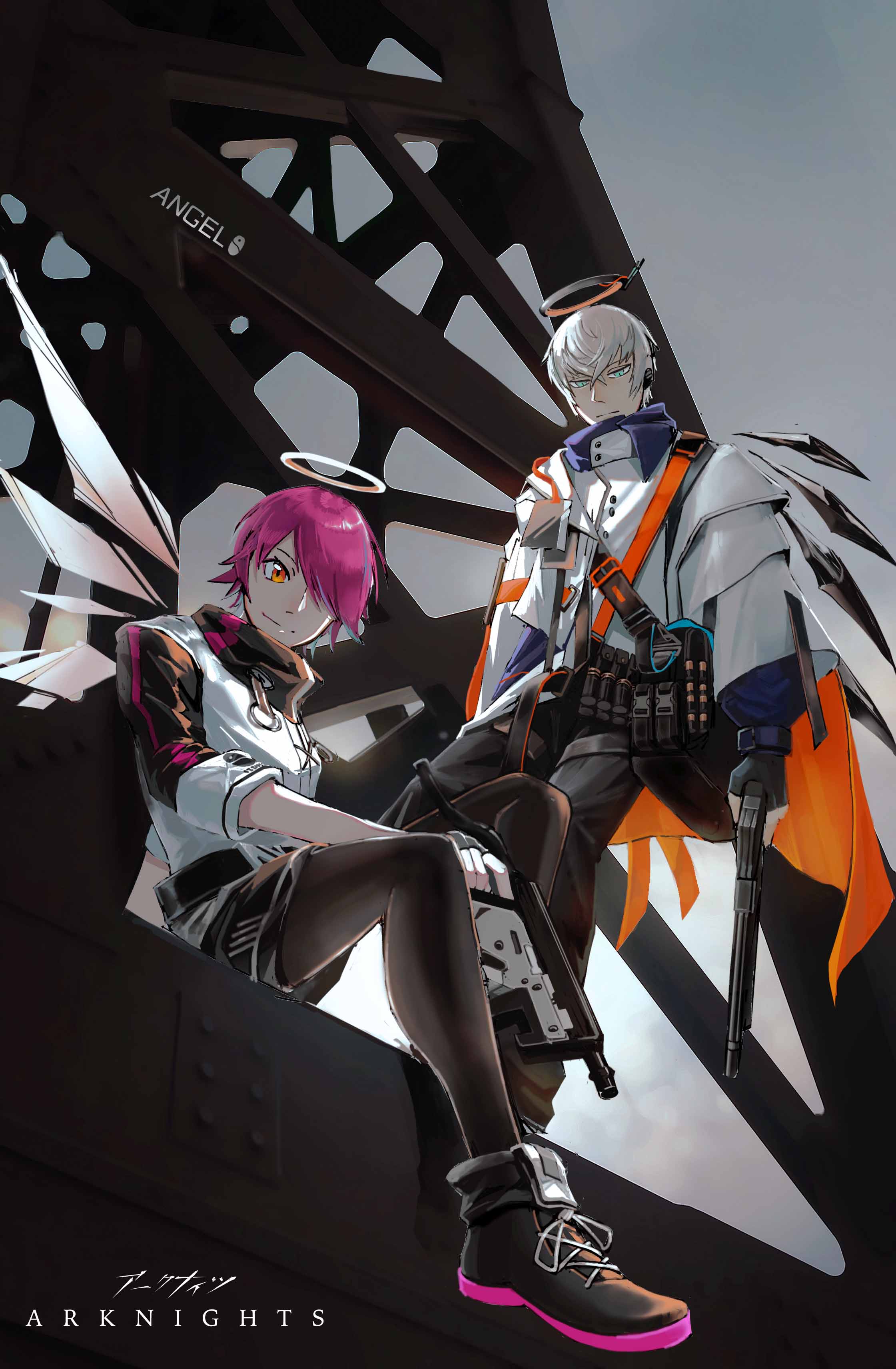 1boy 1girl absurdres arknights black_pantyhose coat copyright_name detached_wings executor_(arknights) exusiai_(arknights) gun hair_over_one_eye halo highres holding holding_gun holding_weapon oaza orange_eyes pantyhose shoes short_hair sitting sneakers traditional_halo weapon white_coat wings
