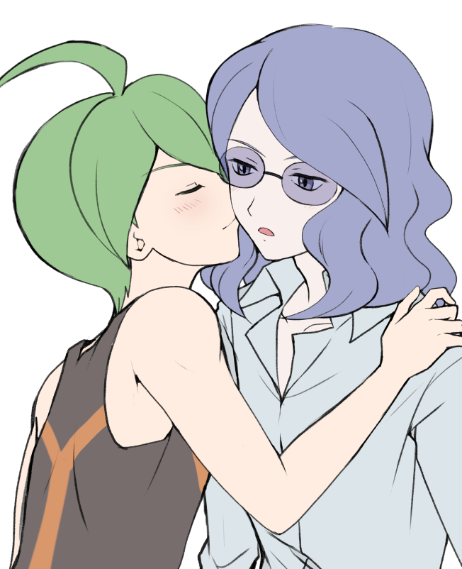 2boys aaron_(pokemon) ahoge akr_(tvfz2233) closed_eyes collared_shirt commentary_request green_hair hand_on_another's_shoulder kiss kissing_cheek light_blush lucian_(pokemon) male_focus multiple_boys nintendo open_mouth parted_bangs pokemon pokemon_diamond/pearl/platinum shirt sleeveless sleeveless_shirt sunglasses upper_body white_background yaoi