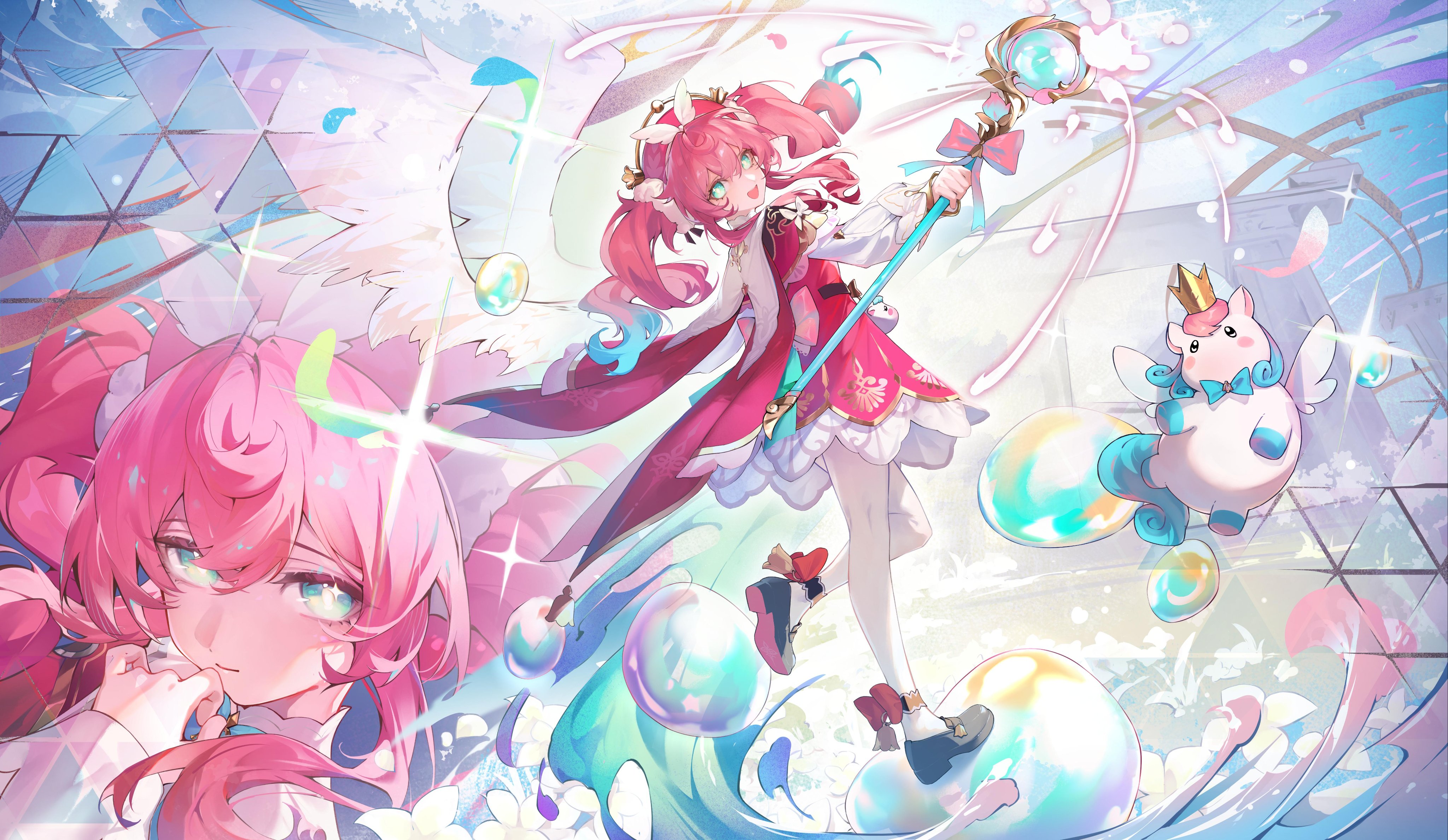 1girl absurdres aqua_eyes aqua_hair black_shoes bubble commentary dress drill_hair hat highres holding holding_staff honkai:_star_rail honkai_(series) hyacine_(honkai:_star_rail) little_ica_(honkai:_star_rail) medium_hair multicolored_hair muta_(csw) open_mouth pantyhose pink_hair red_dress red_hat shoes staff twin_drills two-tone_hair white_pantyhose