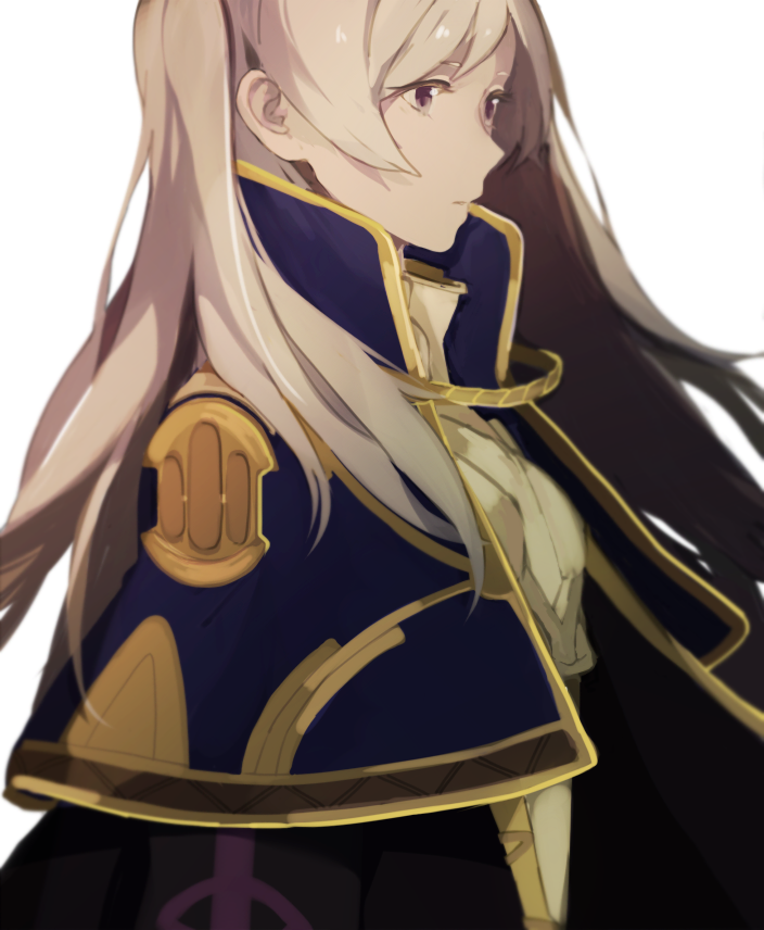 1girl armor black_robe closed_mouth commentary_request female_robin_(fire_emblem) female_robin_(grandmaster)_(fire_emblem) fire_emblem fire_emblem_awakening from_side nintendo official_alternate_costume open_clothes open_robe pararade robe simple_background solo twintails white_background white_hair