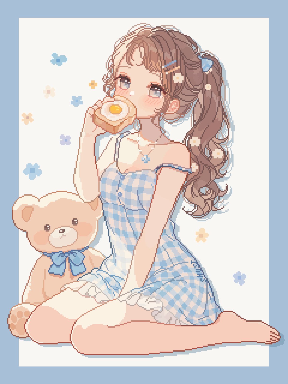 1girl bare_arms bare_legs bare_shoulders barefoot between_legs blue_border blue_bow blue_dress blue_eyes blush border bow bread bread_slice brown_hair dot_nose dress flower food fried_egg gingham_clothes gingham_dress hair_bow hair_flower hair_ornament hand_between_legs hand_up highres holding holding_food long_hair original outside_border pixel_art ponytail short_dress shusi_(6muuu3) simple_background sitting solo strap_slip stuffed_animal stuffed_toy teddy_bear toast two-tone_dress wariza wavy_hair white_background white_dress white_flower