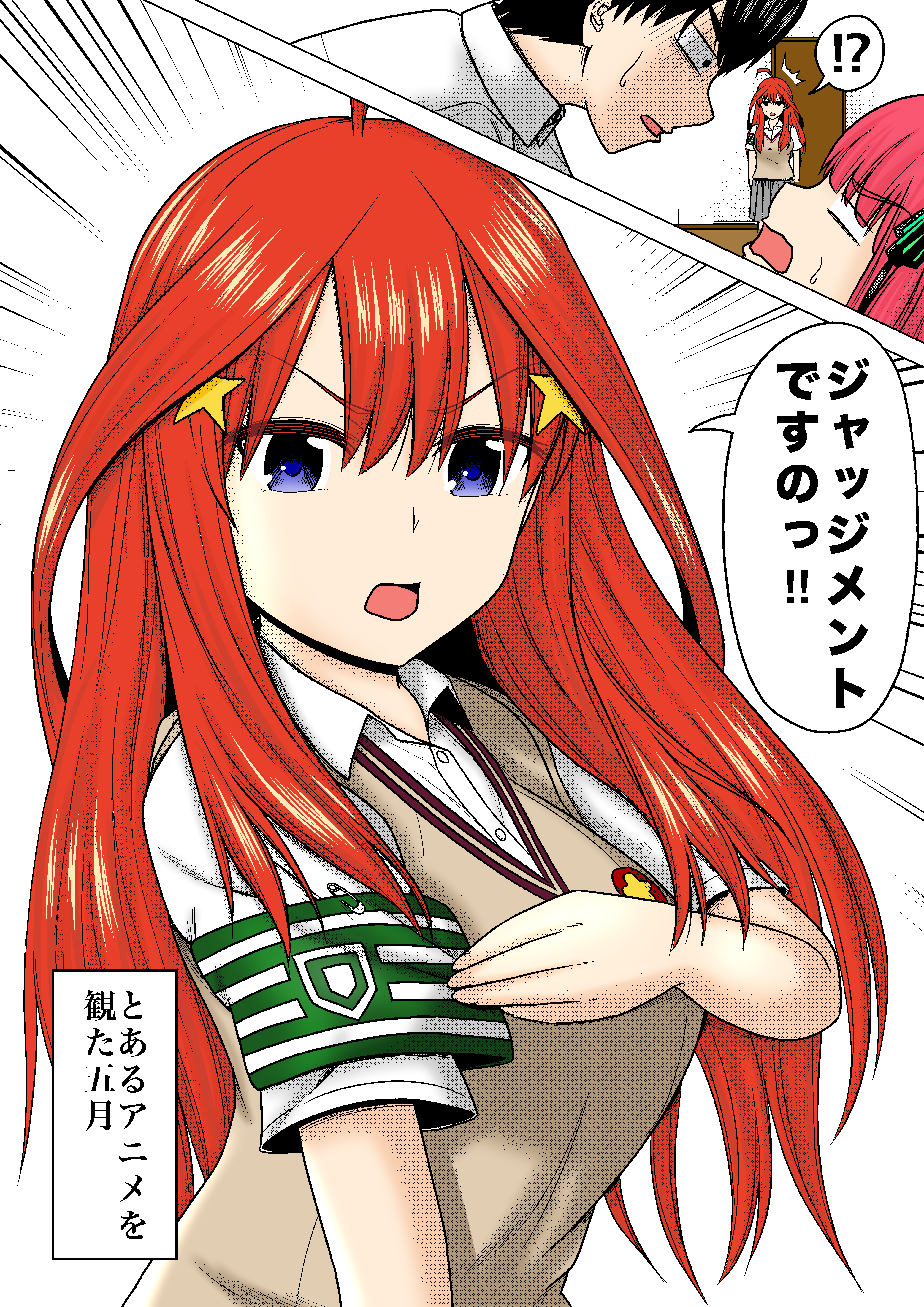 !? 1boy 2girls ^^^ absurdres armband black_hair black_ribbon blue_eyes brown_sweater_vest butterfly_hair_ornament collared_shirt commentary_request cosplay go-toubun_no_hanayome green_armband hair_ornament highres judgement_armband_(toaru) long_hair multiple_girls nakano_itsuki nakano_nino pink_hair pose_imitation red_hair ribbon school_emblem school_uniform shirai_kuroko shirai_kuroko_(cosplay) shirt short_hair short_sleeves speech_bubble star_(symbol) star_hair_ornament summer_uniform sweater_vest toaru_kagaku_no_railgun toaru_majutsu_no_index tokiwadai_school_uniform toyoki_tatenobu translation_request uesugi_fuutarou v-neck white_shirt