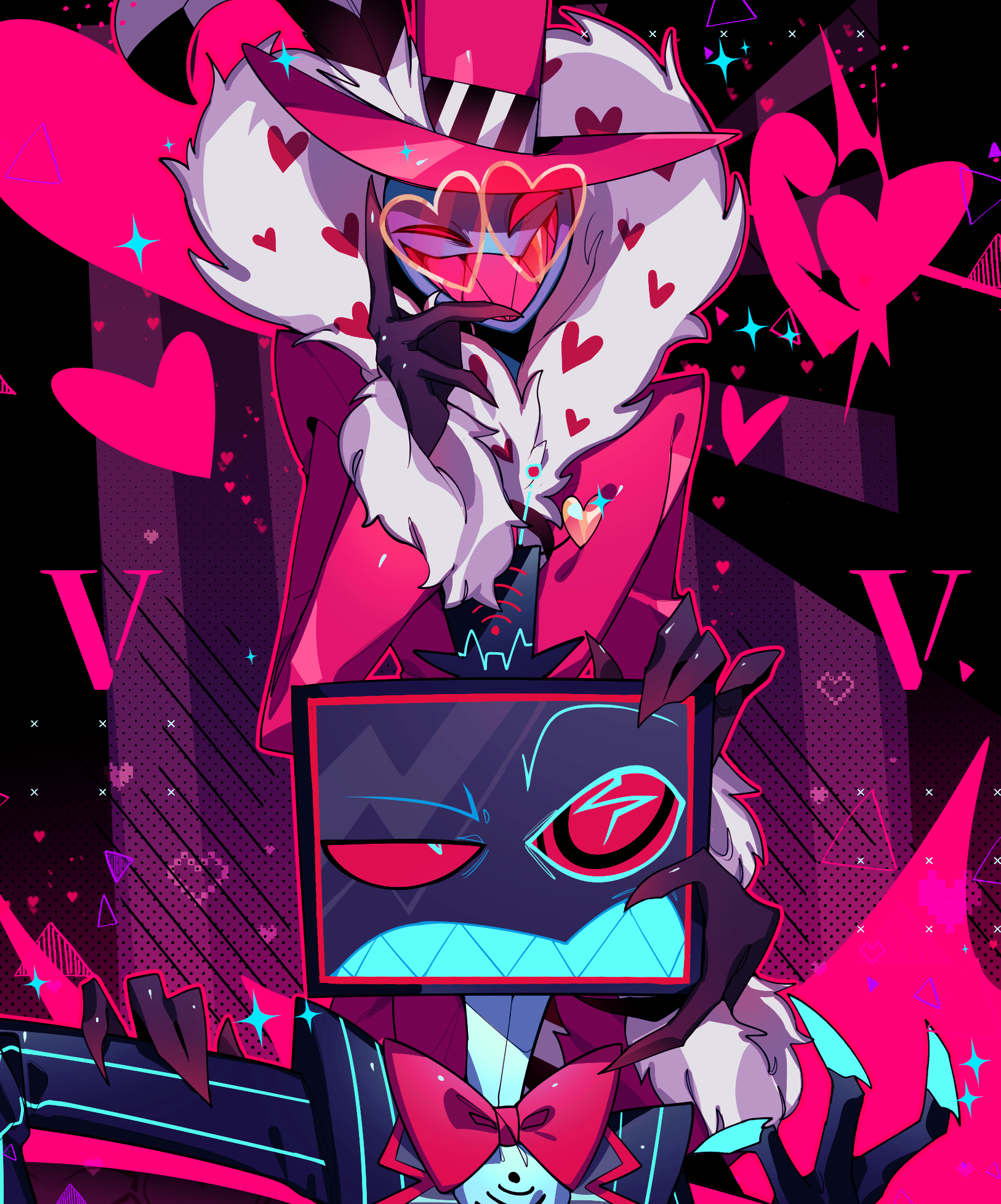 2boys ama0805 coat colored_skin demon_boy formal_clothes fur-trimmed_coat fur_trim hazbin_hotel heart heart-shaped_eyewear hellaverse highres multiple_boys pink_coat purple_skin red_eyes sharp_teeth suit teeth valentino_(hazbin_hotel) vox_(hazbin_hotel) yaoi