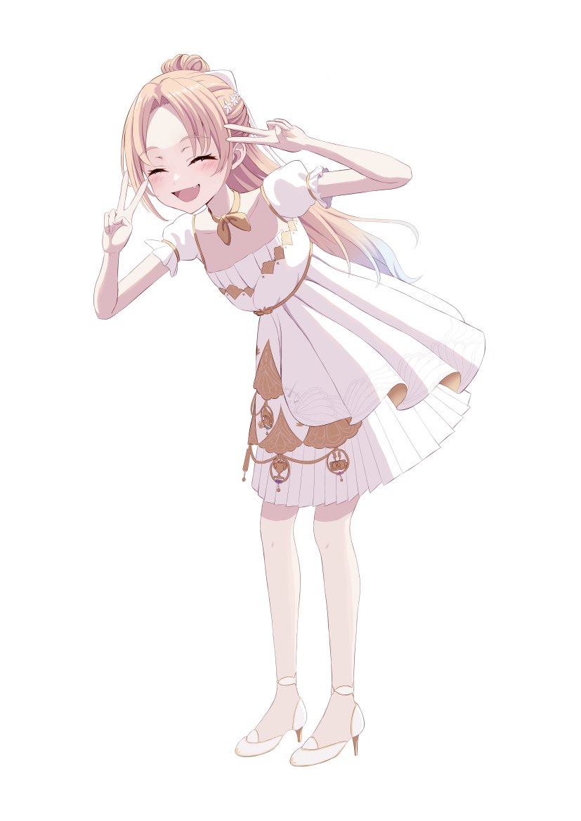 1girl 4th_live_dream_~bloom_the_dream_believers~ ^_^ blonde_hair blue_hair closed_eyes collarbone commentary_request double_v dress facing_viewer flat_chest flower flower_stand_art gradient_hair hair_bun hair_flower hair_ornament high_heels itsudemo_itsumademo_(love_live!) leaning_forward link!_like!_love_live! love_live! medium_dress multicolored_hair neckerchief official_alternate_costume official_alternate_hairstyle osawa_rurino puffy_short_sleeves puffy_sleeves short_sleeves simple_background single_hair_bun solo standing stiletto_heels tachi-e v virtual_youtuber wachida_01d white_background white_dress white_flower yellow_neckerchief