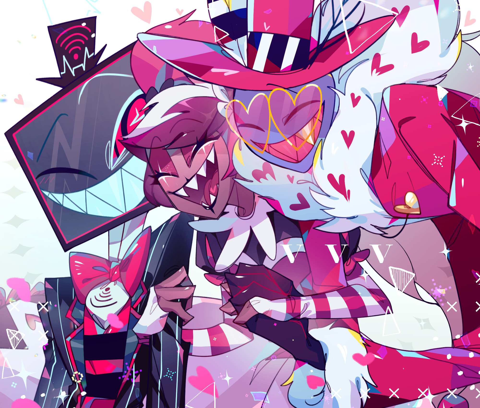 1girl 2boys ama0805 coat colored_skin demon_boy dress fur-trimmed_coat fur_trim hazbin_hotel heart heart-shaped_eyewear hellaverse highres multiple_boys pink_coat pink_dress purple_skin red_eyes sharp_teeth teeth twintails valentino_(hazbin_hotel) velvette_(hazbin_hotel) vox_(hazbin_hotel)
