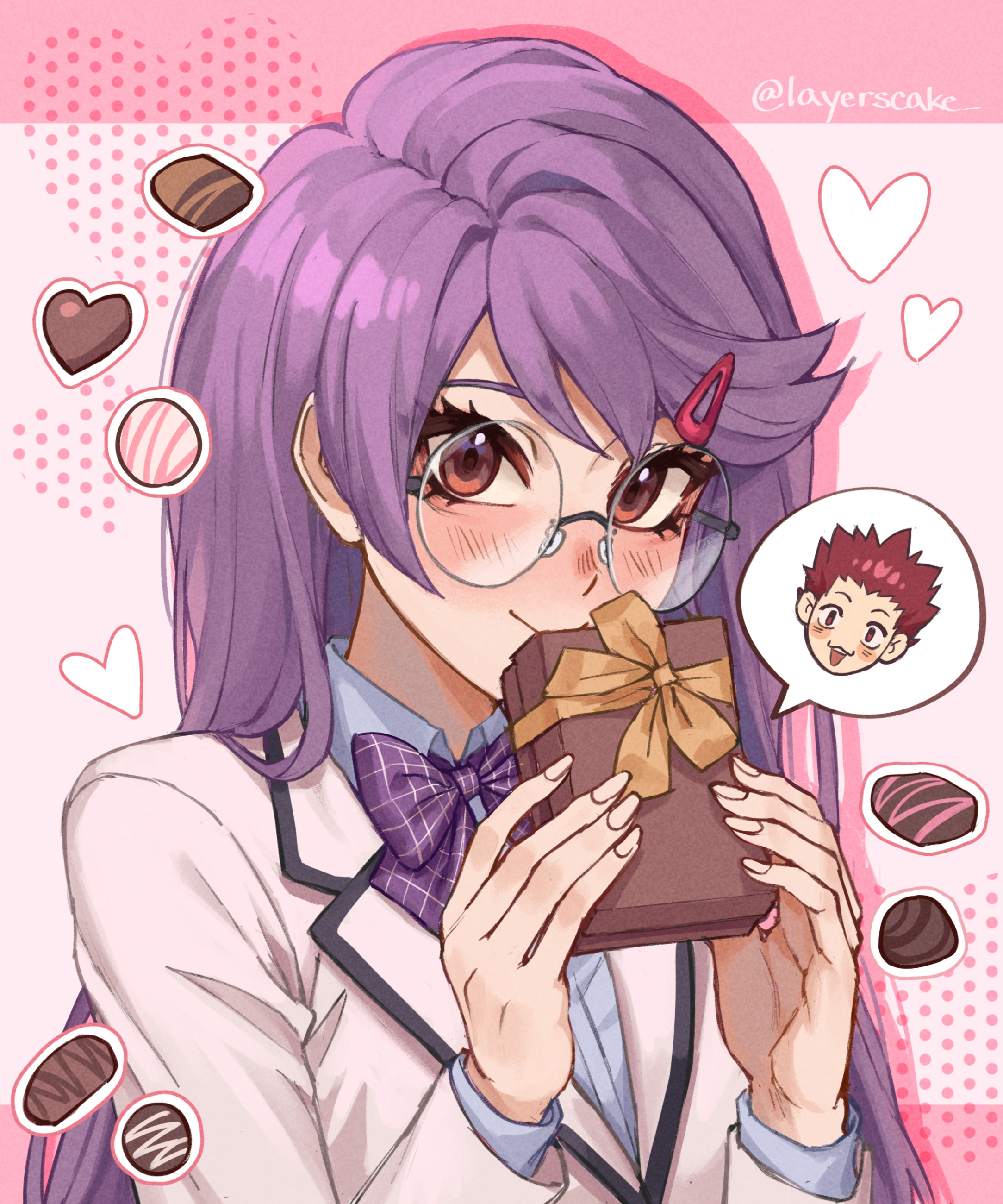 1boy 1girl absurdres art_fight_attack blue_shirt blush bow box brown_eyes chocolate collared_shirt gift_art glasses haikyuu!! heart highres holding holding_box jacket layerscake looking_at_viewer orange_bow original portrait purple_bow purple_hair round_eyewear shirt smile speech_bubble tendou_satori twitter_username white_jacket