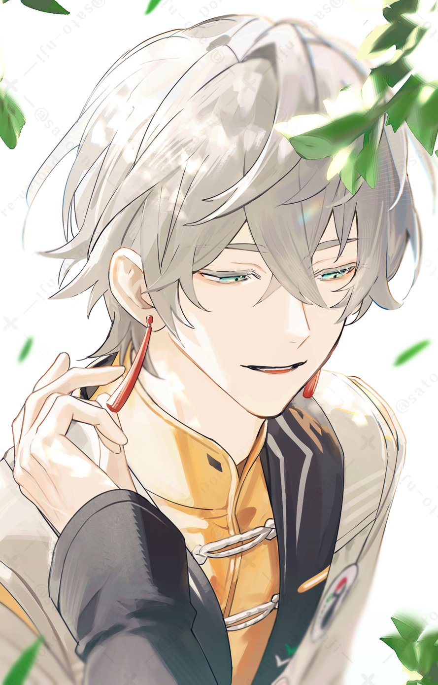 arm_up blue_eyes crossed_bangs ear_piercing earrings falling_leaves grey_hair hair_between_eyes highres jacket jewelry leaf long_sleeves looking_down mandarin_collar official_alternate_costume parted_lips piercing sato_nji shirt short_hair smile tassel tassel_earrings upper_body watermark white_jacket wise_(soaring_crane)_(zenless_zone_zero) wise_(zenless_zone_zero) yellow_shirt zenless_zone_zero