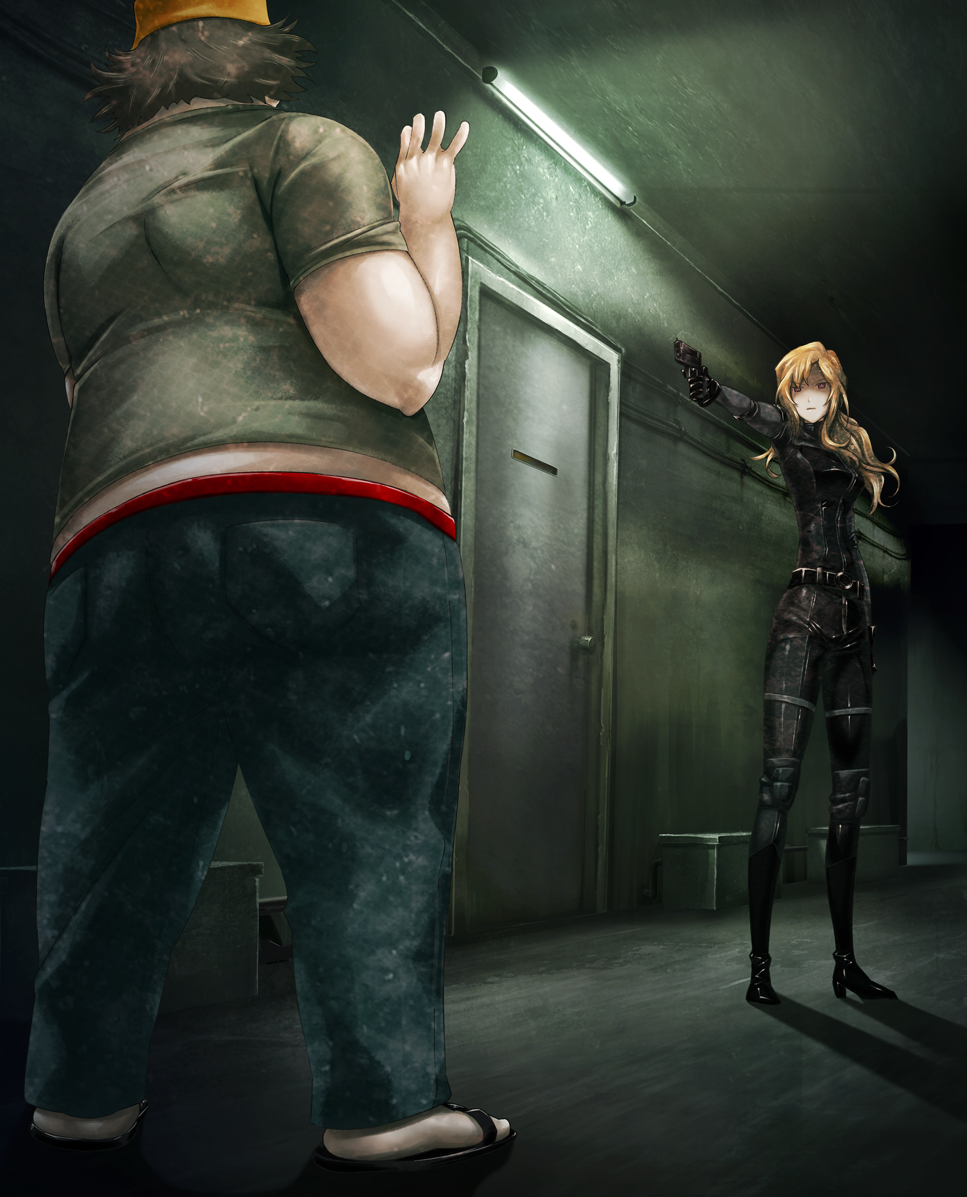 1boy 1girl aiming apartment at_gunpoint belt beret black_belt black_boots blonde_hair blue_pants bodysuit boots dim_lighting fat fat_man from_behind from_below frown full_body game_cg gloves green_shirt gun hair_between_eyes hands_up hashida_itaru hat high_heel_boots high_heels highres holding holding_gun holding_weapon huke indoors jitome kiryuu_moeka latex latex_bodysuit latex_gloves leather leather_belt leather_boots long_hair midriff no_eyewear non-web_source official_art outstretched_arms pants pink_eyes pocket red_belt ringed_eyes sandals science_adventure serious shaded_face shirt short_sleeves skin_tight socks square_pupils steins;gate steins;gate:_linear_bounded_phenogram t-shirt weapon white_socks yellow_hat