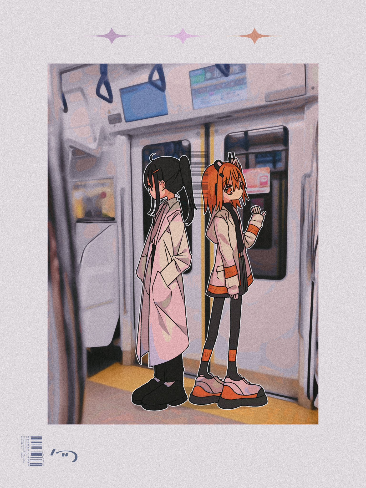 2girls a.i._voice adachi_rei barcode black_hair black_pantyhose black_shoes border coat full_body hand_up hands_in_pockets hashtag-only_commentary highres jacket long_hair long_sleeves medium_hair multiple_girls nasi_(na_si) open_clothes open_jacket orange_eyes orange_hair original pantyhose ponytail shoes signature sneakers standing subway train_interior utau watermark white_coat white_jacket white_shoes