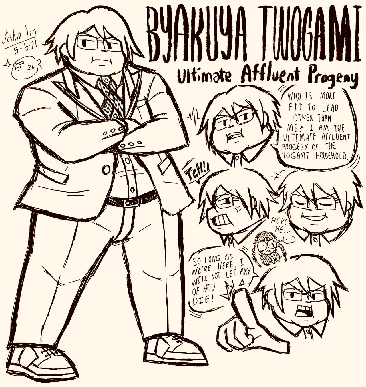 1boy 1girl anger_vein belt buttons character_name closed_eyes closed_mouth collared_jacket collared_shirt crossed_arms danganronpa:_trigger_happy_havoc danganronpa_(series) danganronpa_2:_goodbye_despair dated doodle_inset english_text fat fat_man from_side fukawa_toko full_body glasses greyscale hatching_(texture) highres jacket josh-s26 laughing long_hair long_sleeves male_focus monochrome multiple_views open_clothes open_jacket open_mouth pants pointing pointing_at_viewer round_eyewear shirt shoes short_hair signature simple_background smile speech_bubble standing teeth togami_byakuya_(danganronpa_2) twintails upper_teeth_only v-shaped_eyebrows white_background