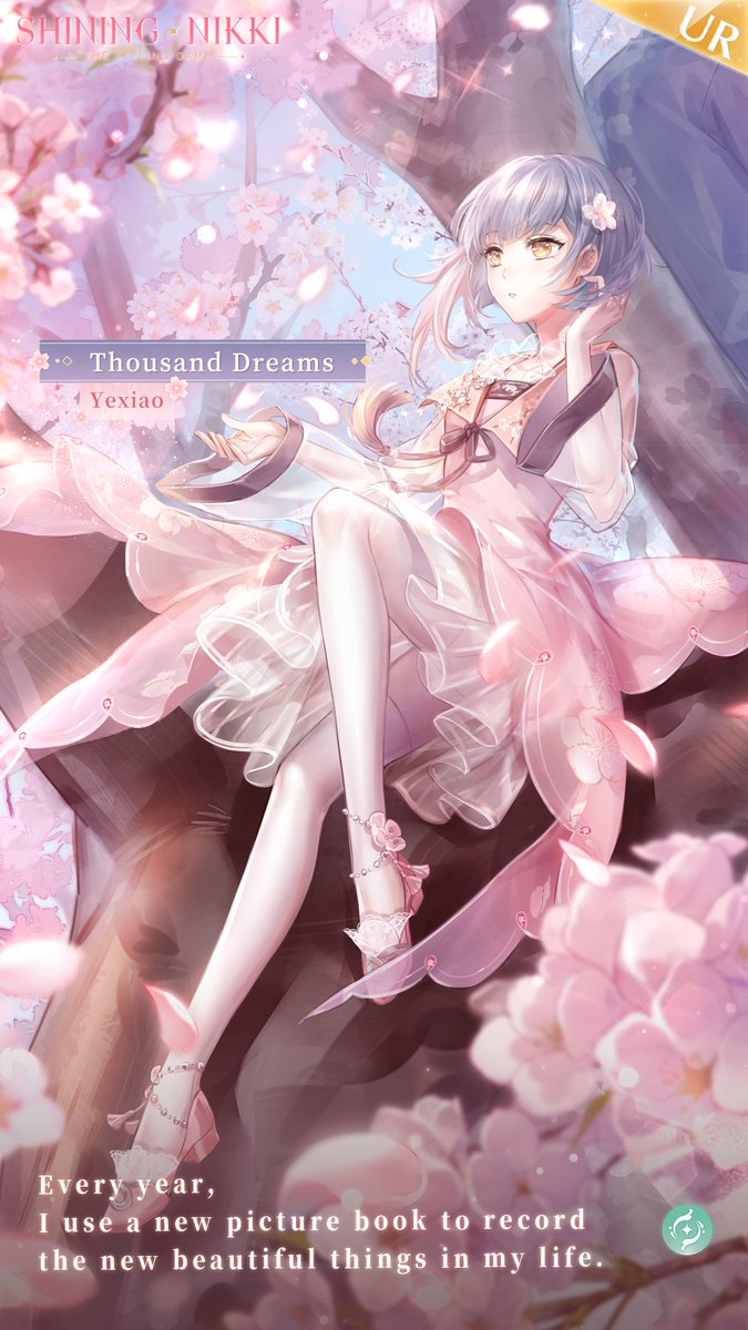 :o artist_request black_ribbon card_(medium) chinese_clothes collared_dress commentary copyright_name day dress english_commentary english_text flower frilled_dress frills grey_hair hair_flower hair_ornament high_heels highres in_tree knees light_particles logo long_sleeves neck_ribbon nikki_(series) official_art outdoors pantyhose parted_lips petals pink_dress pink_flower pink_shoes pumps ribbon second-party_source see-through_clothes see-through_pantyhose see-through_sleeves shining_nikki shoes short_hair sitting spring_(season) swept_bangs thousand_dreams_(shining_nikki) tree white_pantyhose white_sleeves wide_sleeves wind yellow_eyes yexiao_(shining_nikki)