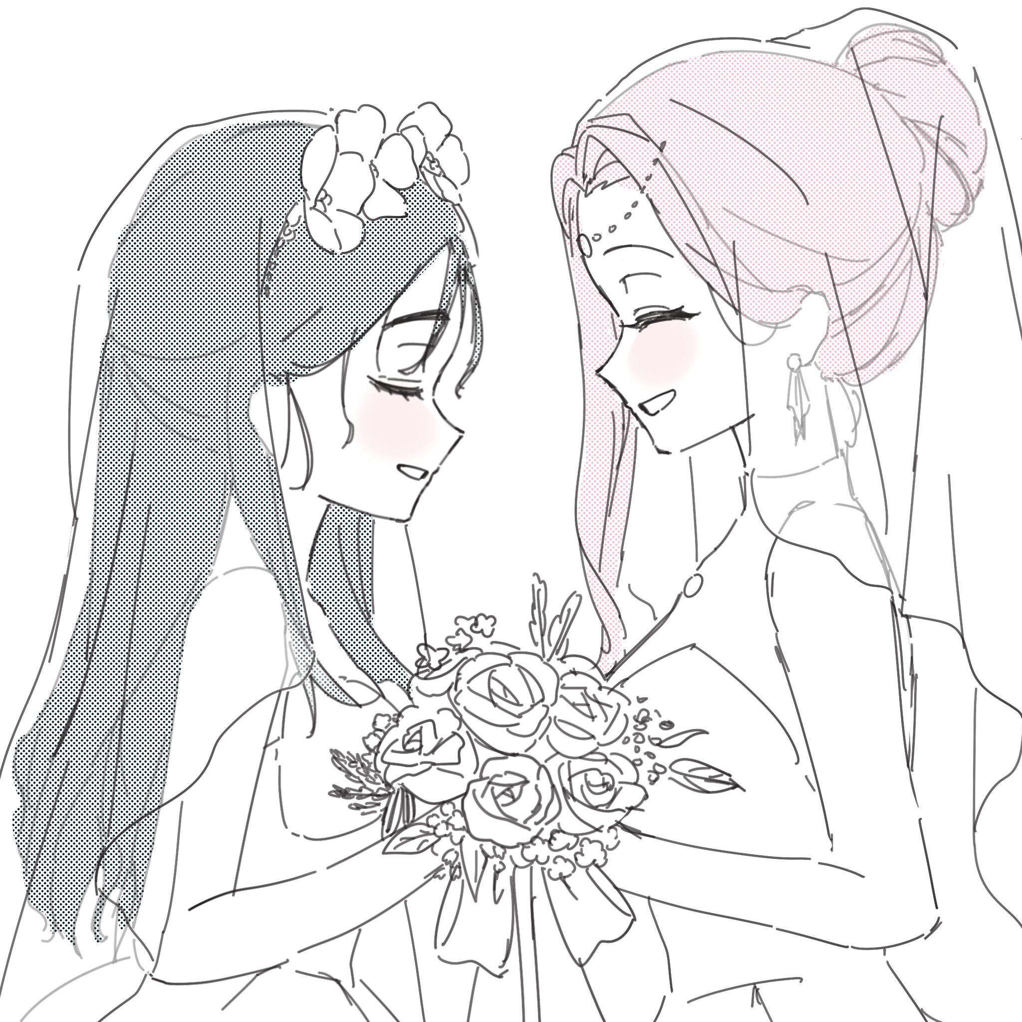 2girls alien_stage black_hair bouquet bridal_veil circlet closed_eyes commentary dress english_commentary female_focus flower hair_bun hair_flower hair_ornament highres holding holding_bouquet long_hair mizi_(alien_stage) multiple_girls oracc_liu partially_colored pink_hair rose see-through_clothes see-through_veil smile sua_(alien_stage) veil wedding_dress wife_and_wife yuri