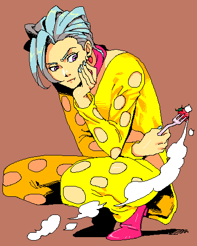 1boy blue_hair commentary_request earrings food food-themed_earrings food_themed_earrings fork fruit full_body head_rest holding holding_fork jacket jewelry jojo_no_kimyou_na_bouken lowres male_focus nedayashi pannacotta_fugo pants pink_shoes purple_eyes shoes solo squatting strawberry strawberry_earrings vento_aureo yellow_jacket yellow_pants