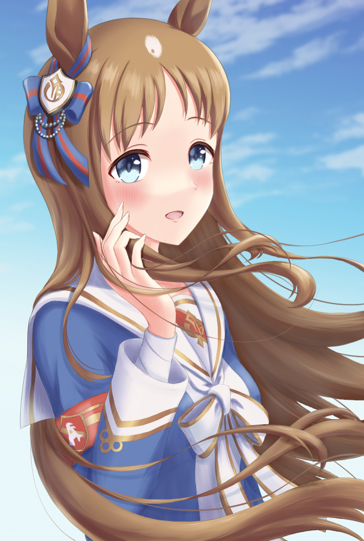 1girl animal_ears armband blue_eyes bow bowtie brown_hair ear_bow from_side grass_wonder_(umamusume) horse_ears horse_girl ichimai_(apieceof_ray151) long_hair long_sleeves looking_at_viewer looking_to_the_side open_mouth red_armband sailor_collar smile solo umamusume upper_body white_bow white_bowtie white_sailor_collar