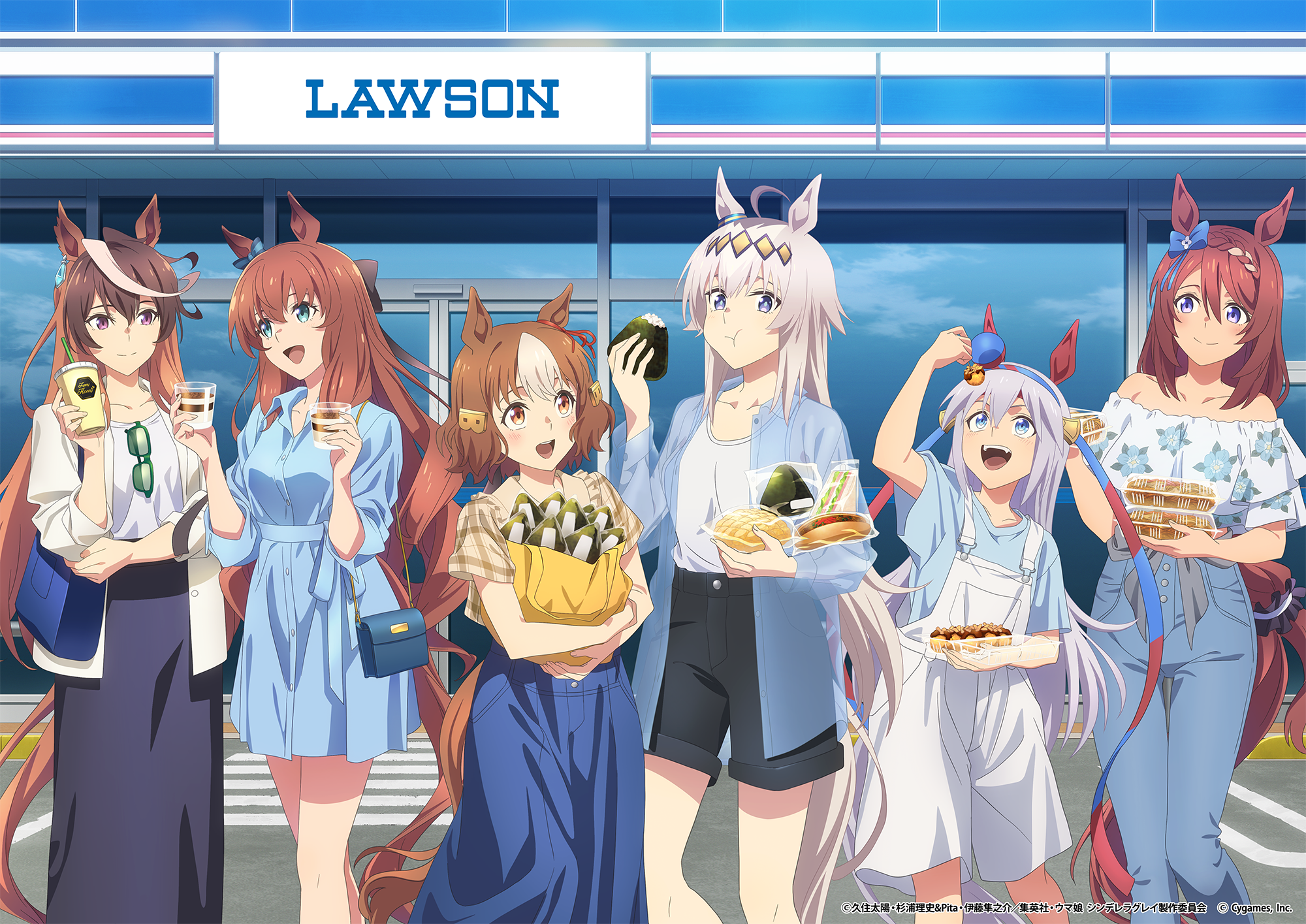 6+girls :d ahoge animal_ears anime_coloring bag belno_light_(umamusume) black_shorts black_skirt blue_dress blue_eyes blue_pants blue_shirt blue_skirt brown_eyes brown_hair collared_dress commentary_request copyright_logo copyright_name crosswalk day denim desert dress eating floral_print_shirt food grey_hair high-waist_pants highres horse_ears horse_girl horse_tail jeans lawson logo long_hair long_skirt long_sleeves looking_at_another looking_at_viewer maruzensky_(umamusume) multicolored_hair multiple_girls off-shoulder_shirt off_shoulder official_art oguri_cap_(umamusume) onigiri open_mouth outdoors overall_shorts overalls pants purple_eyes see-through_clothes see-through_shirt shirt short_dress short_hair short_sleeves shorts shoulder_bag skirt smile standing storefront super_creek_(umamusume) symboli_rudolf_(umamusume) t-shirt tail takoyaki tamamo_cross_(umamusume) umamusume umamusume:_cinderella_gray