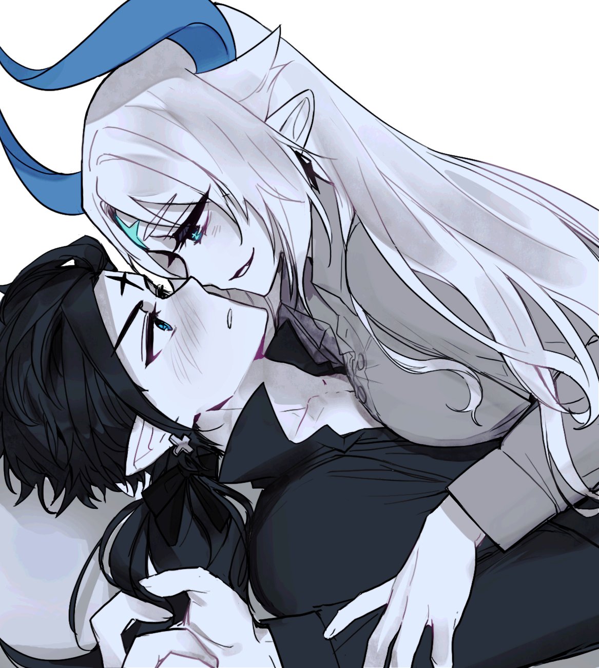 1boy 1girl blue_eyes blue_horns chevalier_(elsword) ciel_(elsword) collared_shirt earrings elsword facial_mark forehead_mark girl_on_top highres horns ishtar_(elsword) jewelry long_hair looking_at_another luciela_r._sourcream lying_on_person mme12165 shirt short_hair simple_background smile upper_body white_background