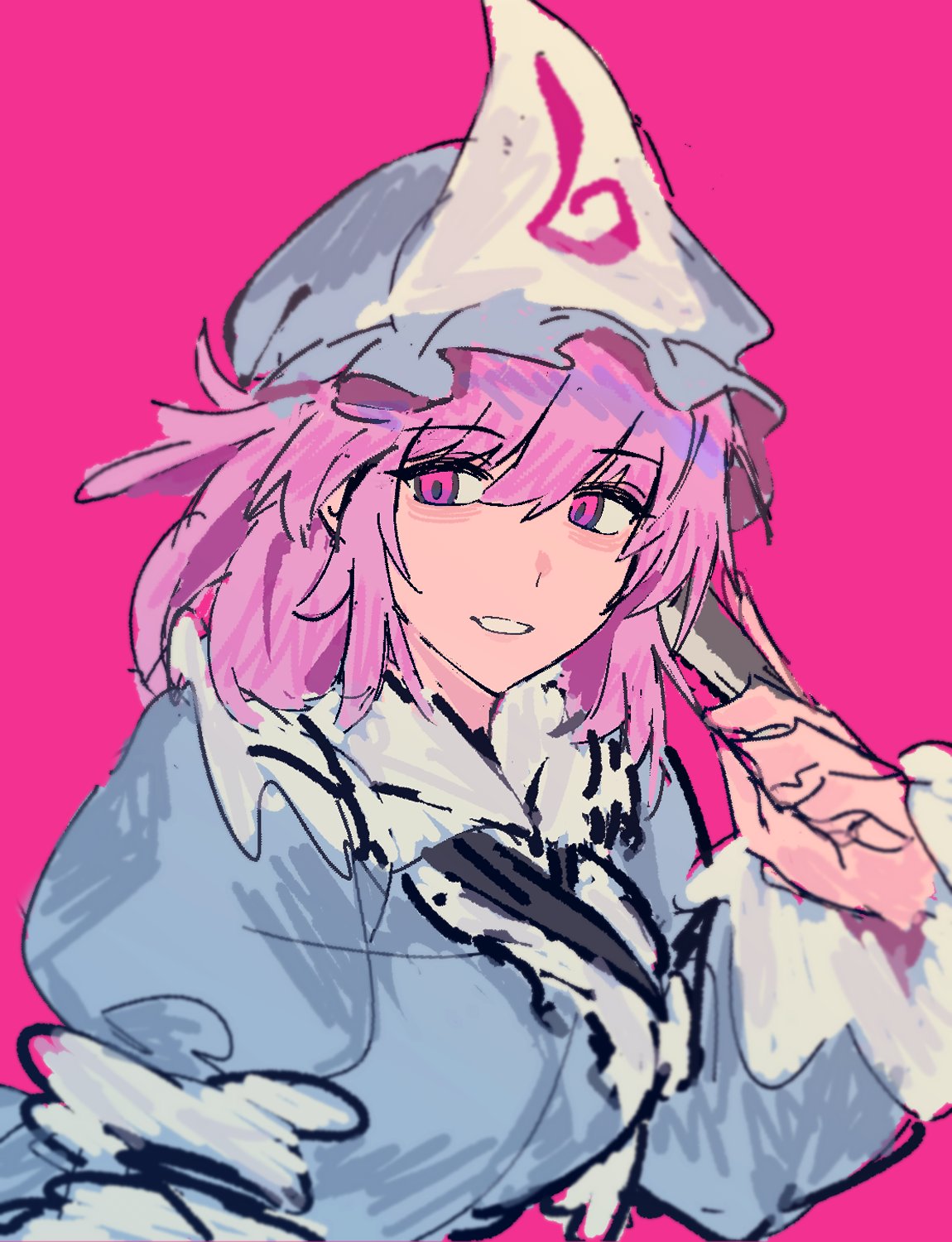1girl blue_hat hat highres looking_at_viewer mob_cap pink_background pink_eyes pink_hair quatro10257041 saigyouji_yuyuko short_hair simple_background smile solo touhou triangular_headpiece upper_body