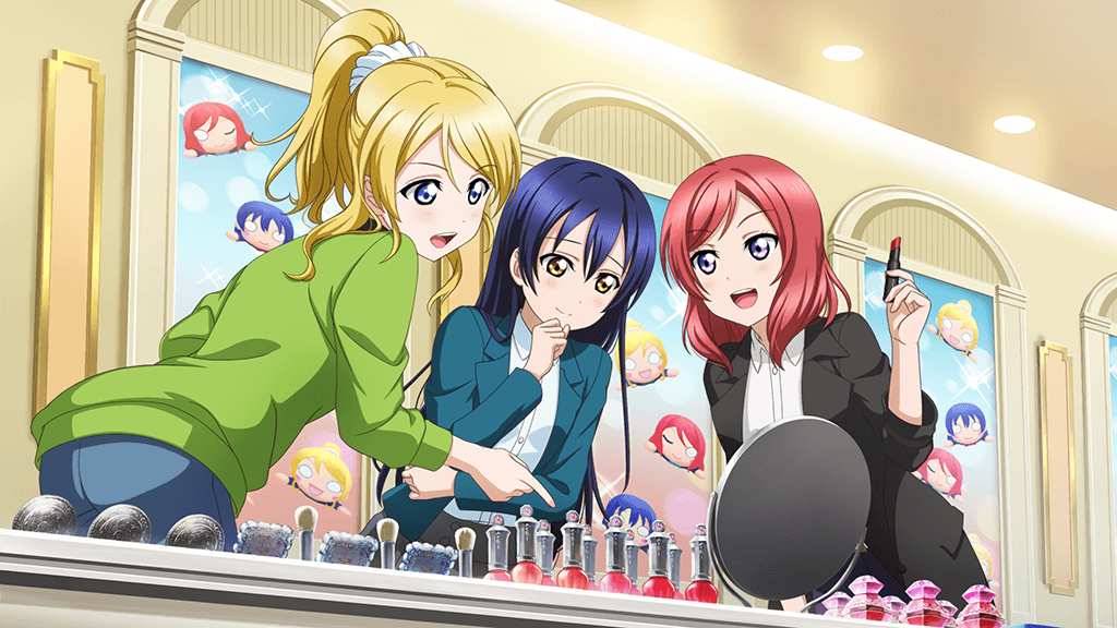 3girls :d arched_back ayase_eli black_coat blonde_hair blue_eyes blue_hair blue_jacket blue_pants blush ceiling ceiling_light closed_mouth coat collared_shirt compact_(cosmetics) cosmetics cowboy_shot dutch_angle from_behind from_below green_shirt hair_between_eyes hand_on_own_chin hand_up holding holding_lipstick_tube indoors jacket lipstick_tube long_hair long_sleeves looking_at_another looking_at_object looking_down looking_to_the_side love_live! love_live!_school_idol_project makeup_brush medium_hair mirror multiple_girls nail_polish_bottle nesoberi nishikino_maki official_art open_clothes open_coat open_jacket open_mouth pants pointing ponytail puchiguru_love_live! purple_eyes raised_inner_eyebrows red_hair scrunchie shirt shop shopping smile sonoda_umi teeth upper_teeth_only white_scrunchie white_shirt yellow_eyes