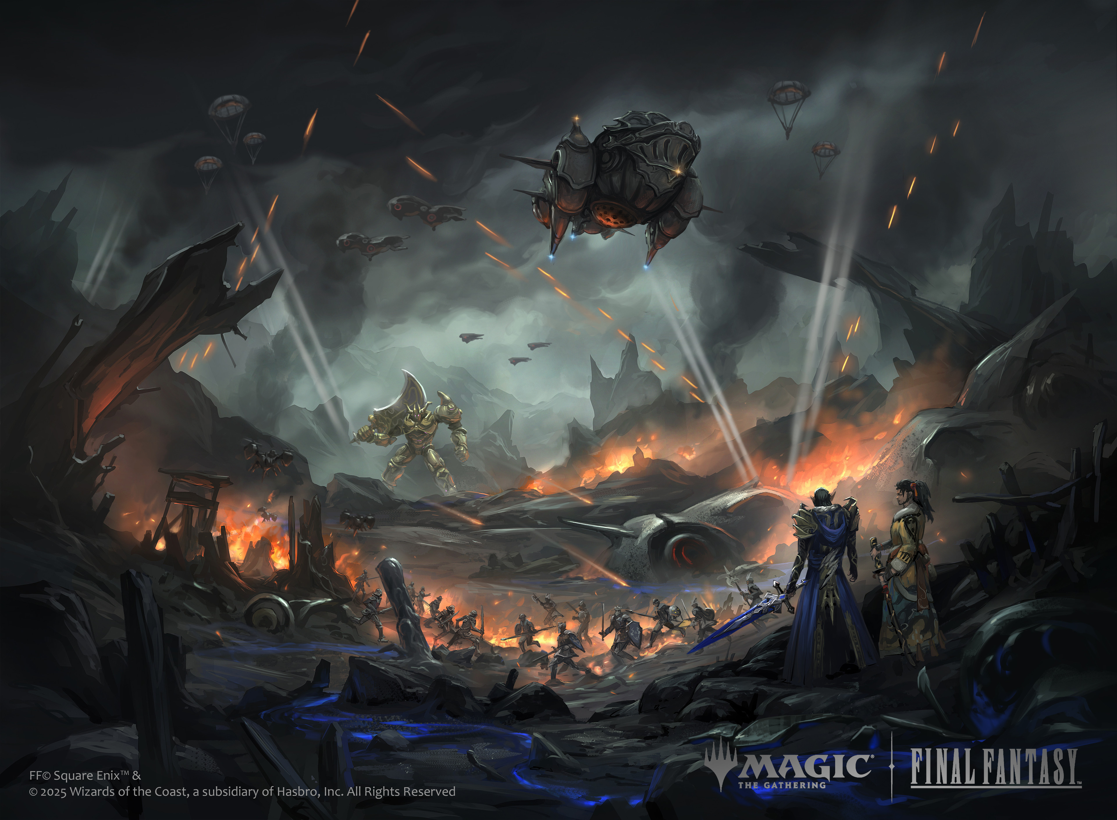absurdres aircraft airship armor aymeric_de_borel battlefield black_hair cloud cloudy_sky copyright_name copyright_notice dark_cloud davidfrasheski destruction final_fantasy final_fantasy_xiv fire hien_rijin highres magic:_the_gathering mecha official_art robot scenery sky smoke standing sword war weapon