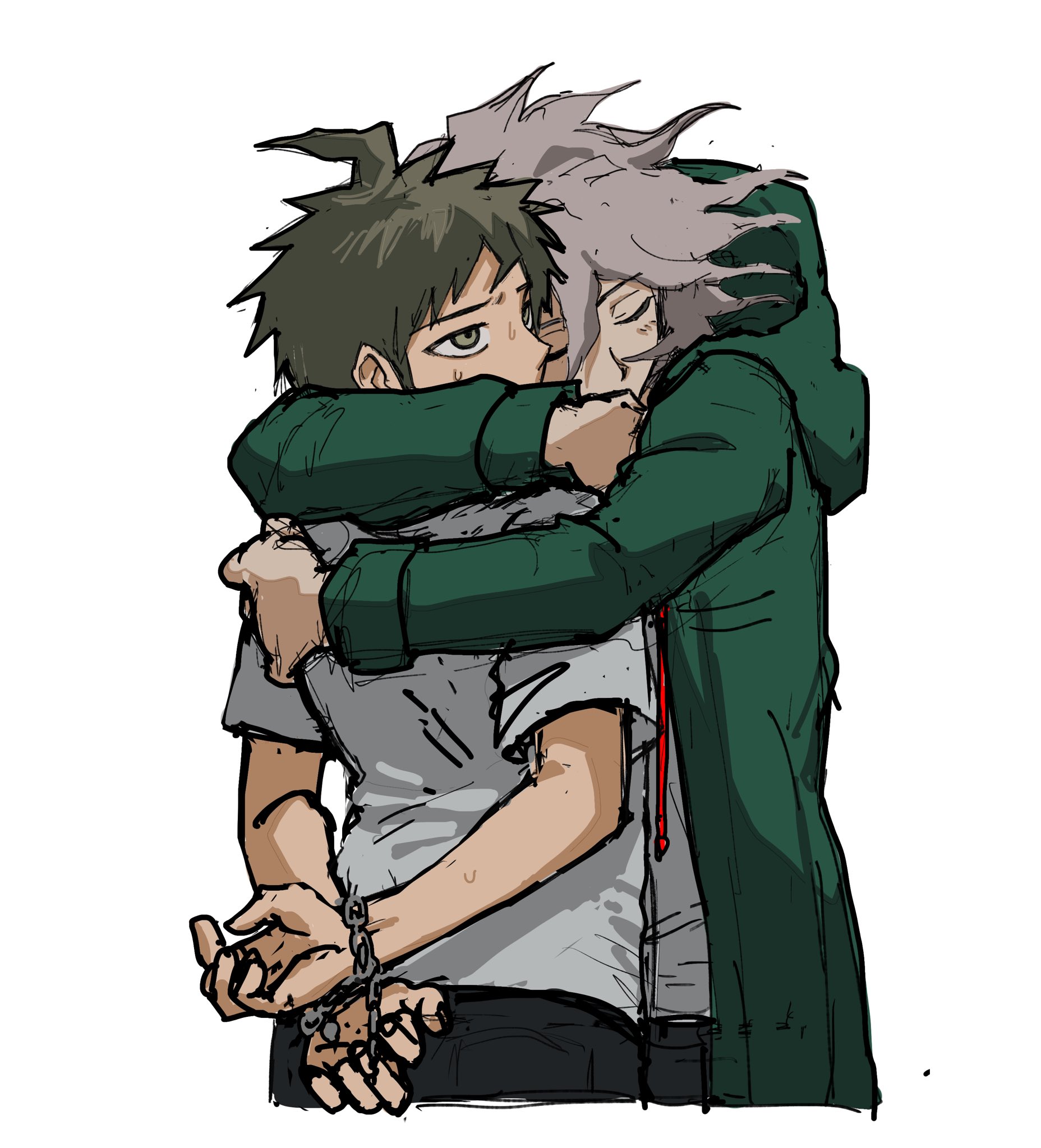 2boys a_fzrja ahoge black_pants bound bound_wrists brown_eyes brown_hair danganronpa_(series) danganronpa_2:_goodbye_despair green_jacket grey_hair grey_shirt highres hinata_hajime hood hood_down hug jacket komaeda_nagito long_sleeves male_focus multiple_boys open_clothes open_jacket pants shirt short_hair simple_background sweat white_background