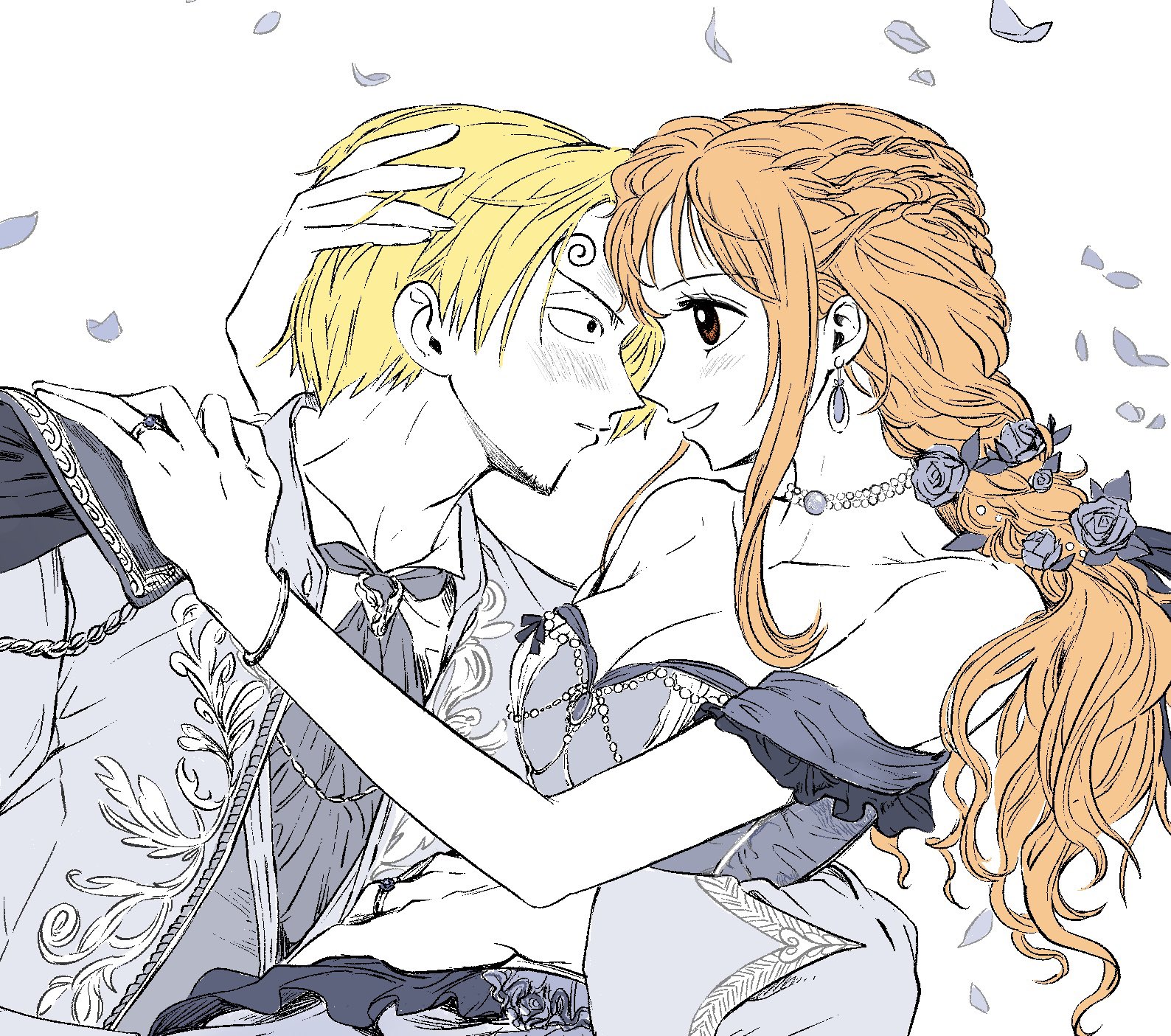 1boy 1girl blonde_hair blush braid close-up commentary_request couple cropped curly_eyebrows dress earrings facial_hair falling_petals goatee hetero highres jewelry korean_commentary nami_(one_piece) necklace off-shoulder_dress off_shoulder one_piece orange_hair petals ring sanji_(one_piece) sidelocks sktkah_7326 upper_body