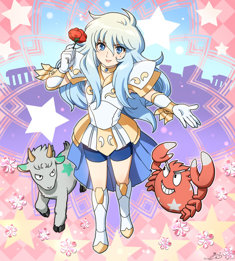1boy adapted_costume alternate_costume animalization armor blonde_hair blue_eyes blue_hair blue_skirt boots cancer_death_mask capricorn_shura crab eyelashes flower gloves goat gold_necklace gold_trim gradient_hair grin hands_up holding holding_flower jewelry knee_boots looking_at_viewer magical_boy male_focus mizuhara_aki mole mole_under_eye multicolored_hair neck_ring necklace open_mouth outstretched_hand pauldrons pink_background pisces_aphrodite red_flower red_rose rose saint_seiya shoulder_armor showgirl_skirt skirt smile solo_focus star_(symbol) trap two-tone_hair v-shaped_eyebrows v-shaped_eyes white_armor white_boots white_gloves
