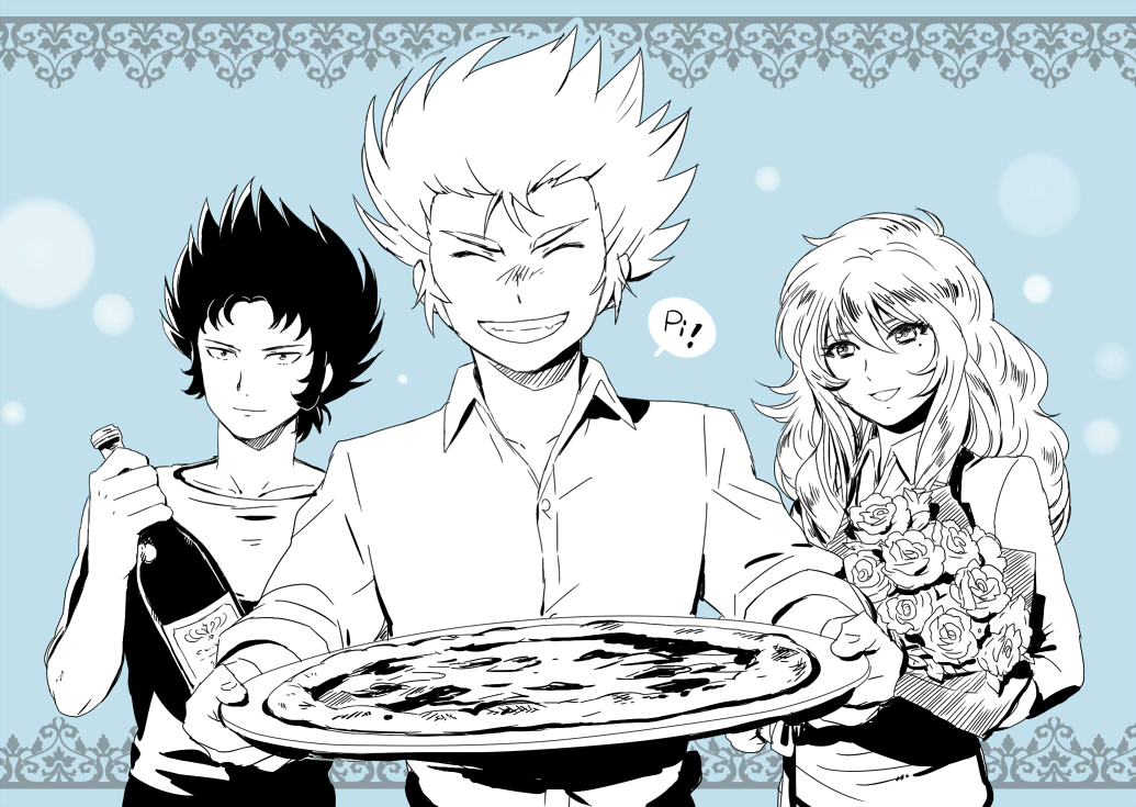 3boys ^_^ alcohol alternate_costume androgynous bishounen blue_background bottle bouquet cancer_death_mask capricorn_shura casual closed_eyes collared_shirt facing_viewer flower food greyscale grin holding holding_bottle holding_food holding_pizza holding_plate incoming_food light_smile long_sleeves looking_at_viewer male_focus mizuhara_aki monochrome multiple_boys parted_lips pisces_aphrodite pizza plate saint_seiya shirt short_hair smile solo_focus speech_bubble spiked_hair upper_body v-shaped_eyebrows wine wine_bottle