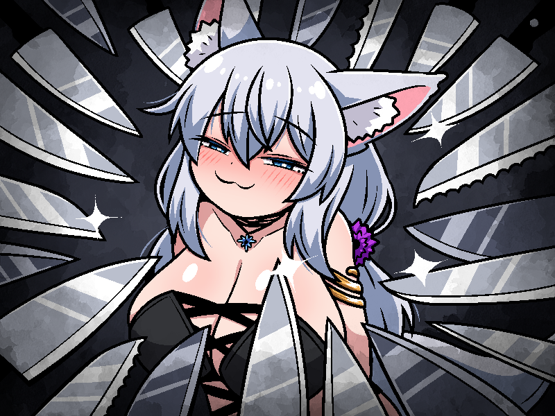 1girl animal_ears blue_eyes breasts fox_ears fox_tail hairband indie_virtual_youtuber ink_(inksgirls) jewelry kirsche_verstahl knife knife_cat_(meme) large_breasts long_hair meme necklace smug tail virtual_youtuber
