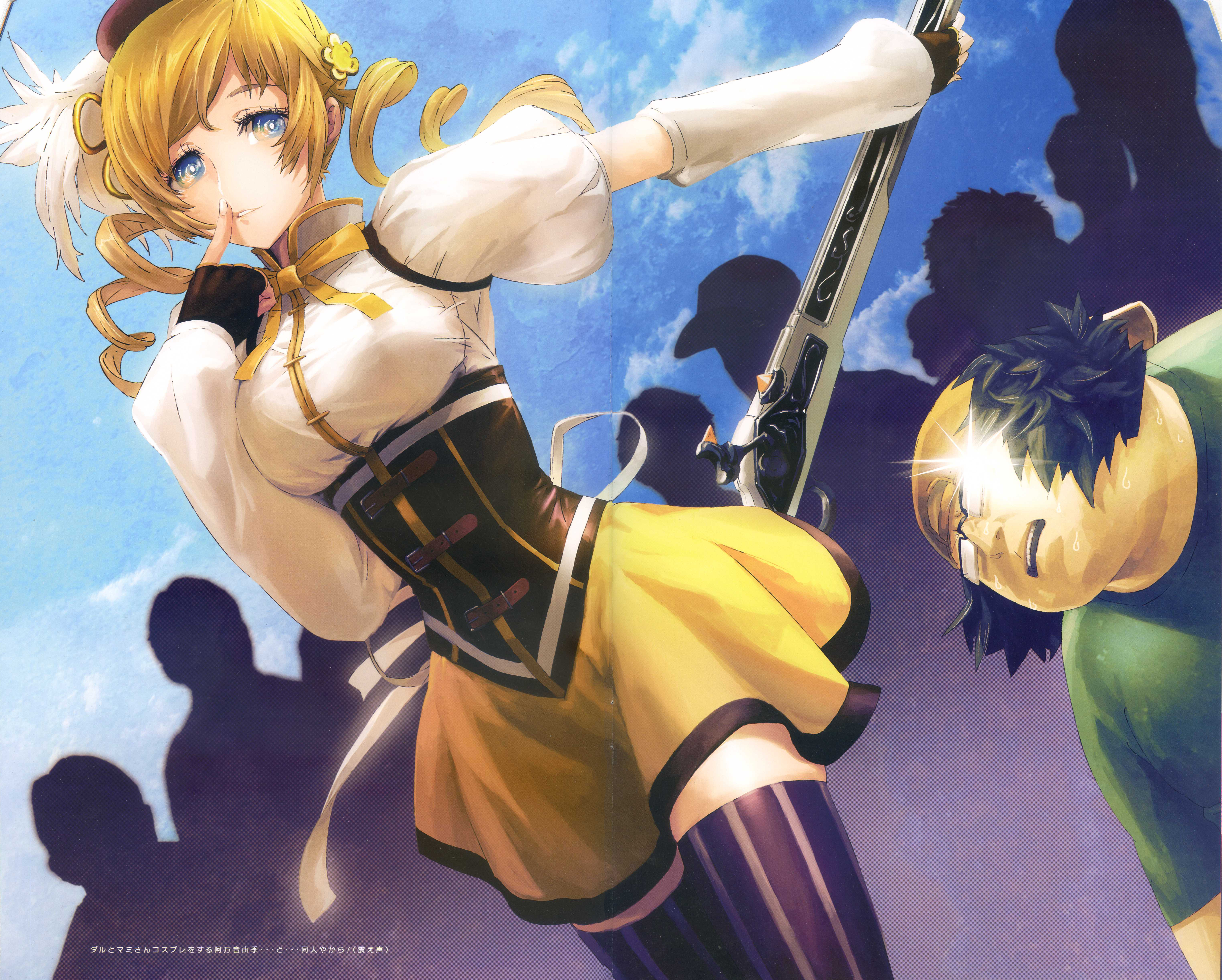1boy 1girl absurdres amane_yuki baseball_cap black_hair blonde_hair blue_background blue_eyes corset cosplay drill_hair finger_to_face fingerless_gloves glasses glint gloves gun hashida_itaru hat hat_feather highres huke magical_girl magical_musket_(madoka_magica) mahou_shoujo_madoka_magica mahou_shoujo_madoka_magica_(anime) non-web_source official_art opaque_glasses purple_background scan science_adventure skirt steins;gate steins;gate:_eigou_kaiki_no_pandora sweat thighhighs tomoe_mami tomoe_mami_(cosplay) tomoe_mami_(magical_girl) translation_request twin_drills twintails weapon