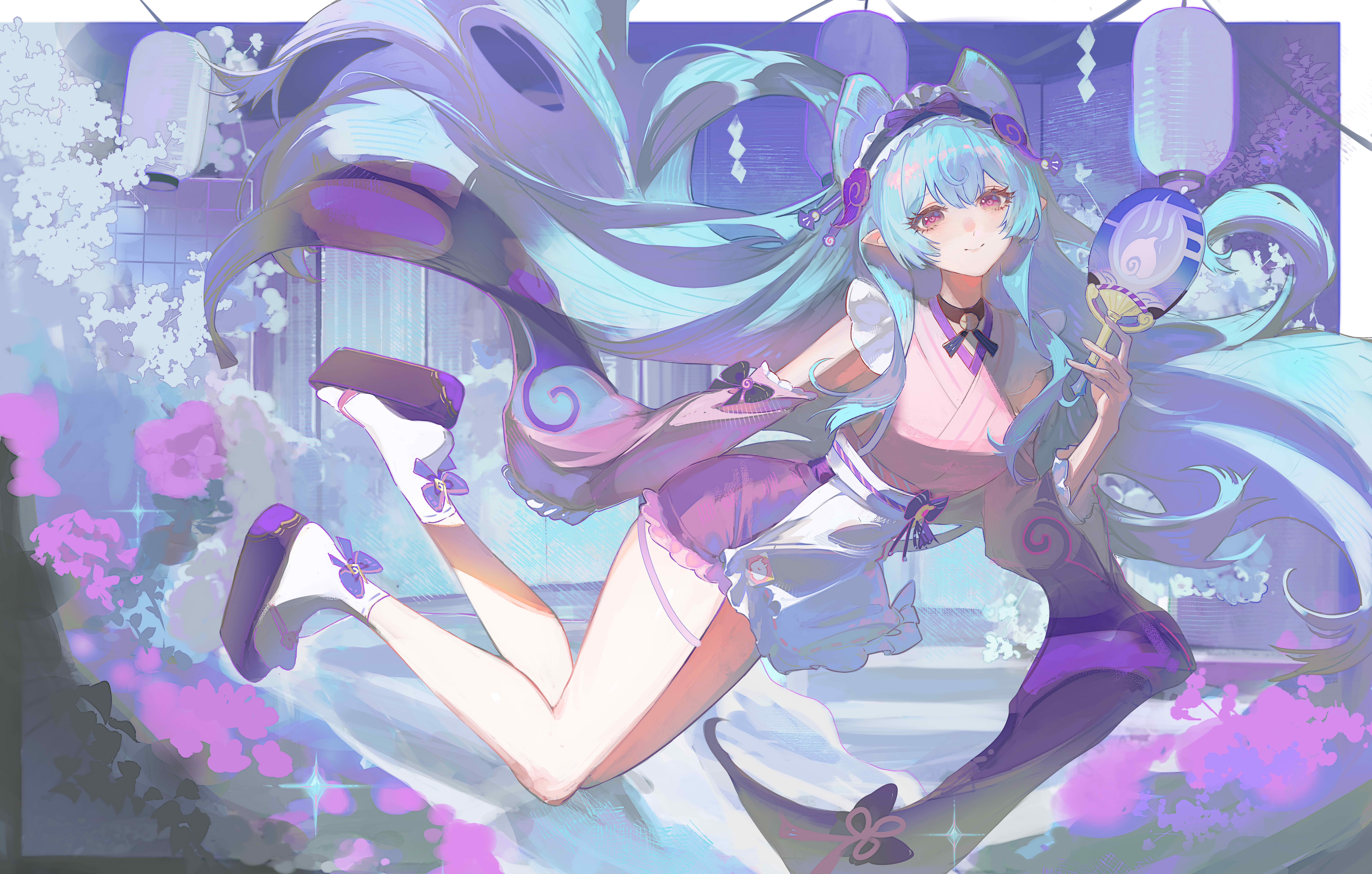 1girl absurdres apron bell black_choker black_hairband black_sandals blue_hair bow bow_hairband chinese_commentary choker closed_mouth commentary_request detached_sleeves floating flower frilled_hairband frills full_body genshin_impact hairband hand_fan highres holding holding_fan japanese_clothes kimono lantern long_hair long_sleeves looking_at_viewer neck_bell nihongami okobo outdoors paper_fan paper_lantern pink_kimono pink_sleeves platform_sandals pointy_ears purple_bow purple_eyes purple_flower sandals sash short_kimono sleeve_bow sleeveless sleeveless_kimono smile socks solo tabi uchiwa waist_apron white_apron white_sash white_socks wide_sleeves yumemizuki_mizuki yutou_(yutou75)